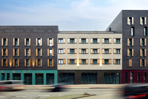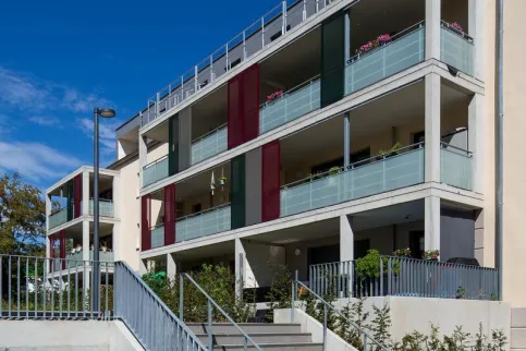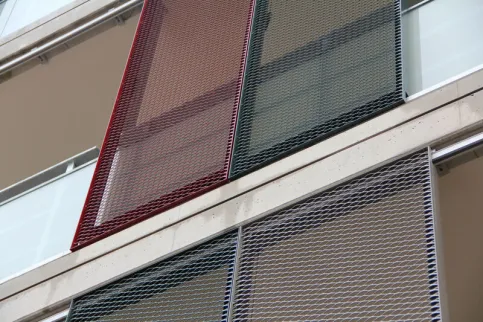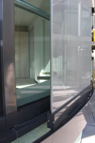 Dank der Schiebeläden werden die unterschiedlichen und verputzten Gebäude trotz ihrer heterogenen Gestalt zu einer Einheit. Durch das feine Maschennetz des Streckmetallgitters dringt auch bei geschlossenem Zustand noch ein angenehmes Licht auf den Balkon, sodass sich die Bewohner auch dank des semitransparenten Glasgeländers nicht abgeschottet fühlen. Füllungen aus Lochblech bieten diverse gestalterische Variationsmöglichkeiten an.