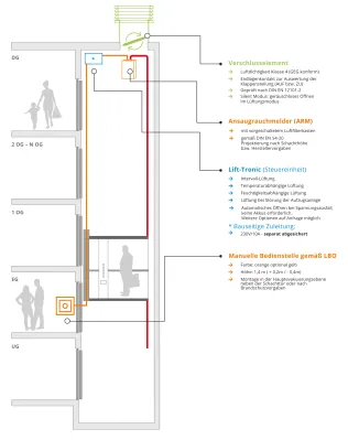 Systeme zur Aufzusschachtentrauchung sollen ein Rauchübertritt von einem in den anderen Brandabschnitt verhindern. Hierfür wird über geeignete Rauchdetektoren im Schacht der Rauch erkannt und die Verschlussklappe umgehend geöffnet.