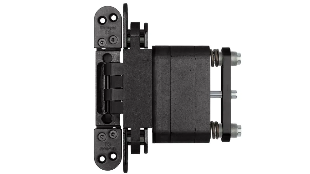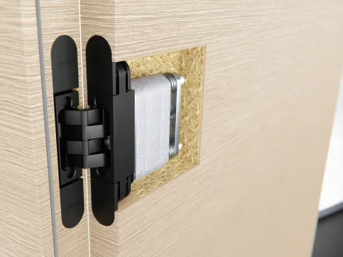 Mit dem verdeckt liegenden Band „PIVOTA® DXS 3-D Close“ schließen Türen sanft und selbsttätig. Version 2.0 ist mit einem Stahlgelenk und einer damit verbundenen Schließmechanik ausgestattet, die wie das Band in der Türfräsung verschwindet. Das bedeutet: Die Technik, auch zusätzliche Bauteile für den integrierten Türschließer, arbeitet im Verborgenen. Das Band bleibt voll funktionsfähig: Es ist dreidimensional justierbar und sorgt dafür, dass sich die Tür bis zu einem Winkel von 180 Grad öffnen lässt.