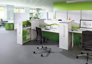 Zum Einsatz kommen mobile Heckenelemente mit akustisch wirksamen Absorber und Lamellenwände, die im Zusammenspiel fúr mehr Privatsphäre und ein gesundes Klima sorgen. Ausreichend Stauraum und bequeme Arbeitsflächen bieten Büroschränke, Auszugschränke/Apothekerschränke und Schreibtische der Serie Asisto.