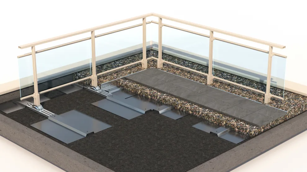 Das Produkt Panorama ST eignet sich, um Flachdachflächen im Neubau oder Gebäudebestand als zusätzlichen Wohnraum zu gestalten. Das System ist selbsttragend ausgelegt – die notwendige Stand- und Kippsicherheit wird durch externe Auflast, z. B. Kies, Begrünung oder Bodenplatten, gewährleistet. Unter Berücksichtigung der erforderlichen Auflast pro m2 wird der Belagaufbau auf die Unterkonstruktion bestehend aus Auslegerschienen und Lastaufnahmebleche aufgebracht. Das System muss nicht zusätzlich verankert werden: eine Durchdringung der empfindlichen Abdichtung ist somit nicht notwendig und auch die Bildung von Wärmebrücken ist ausgeschlossen. Die selbsttragende Konstruktion garantiert, dass eventuelle Gewährleistungsregelungen für die Abdichtung des Flachdachs bzw. der Dachterrasse nicht verletzt werden.