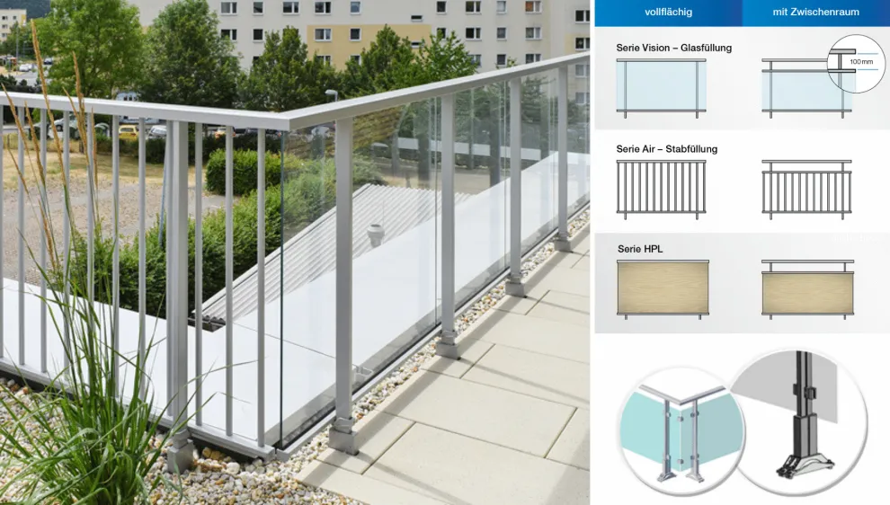 Die mögliche Konfiguration ist abhängig von objektspezifischen Gegebenheiten. Hierbei spielen besonders die Art der gewählten Füllung (Stab- oder Glas-/HPL Füllung), sowie objektspezifische Gegebenheiten (z.B. Dicke der Betonplatte, max. Füllungshöhe, etc.) eine wichtige Rolle.