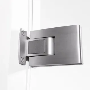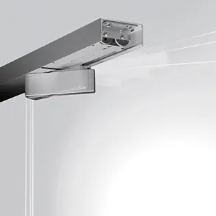 Der Glasbeschlag für Pendeltüren RP arbeitet mit einem Rahmentürschließer dormakaba RTS, der verdeckt in einem durchgehenden Rahmenprofil liegt. Die Anbindung des Türflügels erfolgt über einen oberen und einen unteren Eckbeschlag. Für die Verbindung nach unten reicht ein Aufschraub-Bodenlager. Der Fußboden bleibt also nahezu intakt. Ein Vorteil gerade bei besonders wertvollen Bodenausstattungen oder Fußbodenheizungen.