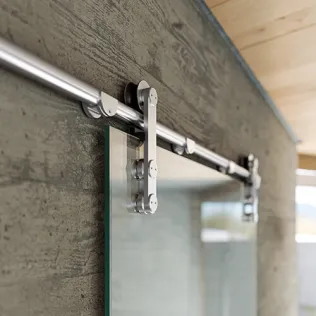 Ob nahezu unsichtbar oder mit repräsentativem Hingucker, die MANET Glasbeschläge für ein- oder doppel-flügelige Innentüren passen in jede Einrichtung. Auch höhere Glasstärken sind für die Bänder von DORMA-Glas kein Problem. Charakteristisch für den Schiebetürbeschlag MANET ist Edelstahl als Beschlagmaterial, sichtbar auf Laufstangen geführte Rollen sowie das markante Punkthalter-Design. Standardisiert werden alle Bauteile in der Werkstoffqualität 1.4305 für normale Innenanwendungen gefertigt. Mit Hilfe der standardisierten MANET Schiebetür Sets wird eine einfache und schnelle Planung der gängigen Anlagentypen ermöglicht. Frei wählbares Zubehör erlaubt unterschiedliche Gestaltungsmöglichkeiten für jeden Anlagentyp.