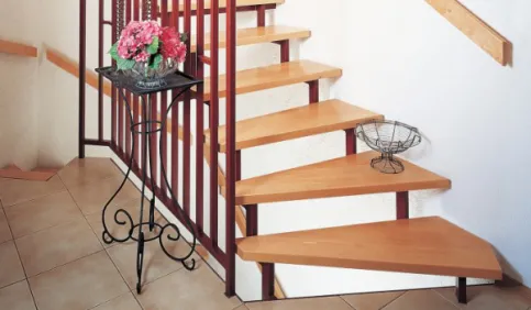 Ganzholztreppen werden in der Standardausführung Buche bunt, keilgezinkt gefertigt. Andere Massivholzarten sind verfügbar und verschiedene Holzkombinationen sind bei der Wahl von Stufen und Wangen möglich.