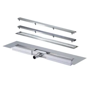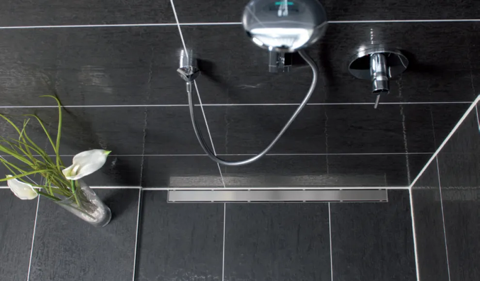 Das Basissystem – bestehend aus Edelstahl-Rinnenkörper, mit Geruchsverschluss, Dichtmanschette und integriertem Fixbauadapter, Drainrahmen und Wendeauflage. Komplett einbaufertig vormontiert. Alle Metallteile aus Edelstahl mit elektropolierter Oberfläche.