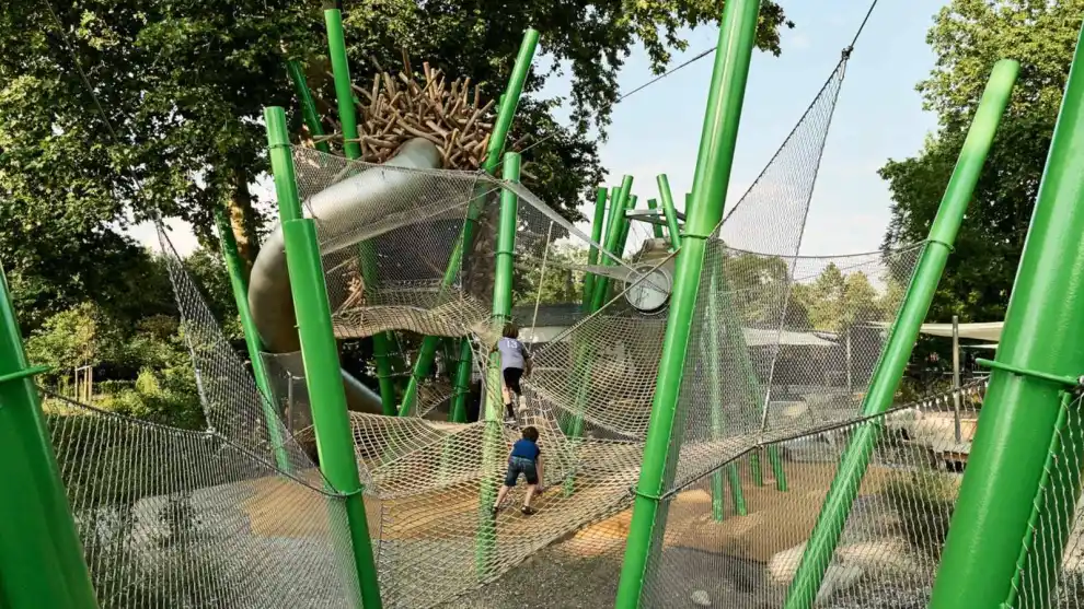 Auf Spielplätzen kommt die breite Produktpalette von Jakob Rope Systems zur Anwendung: Fasernetze zum Klettern und Drahtseilnetze für die Sicherheit.