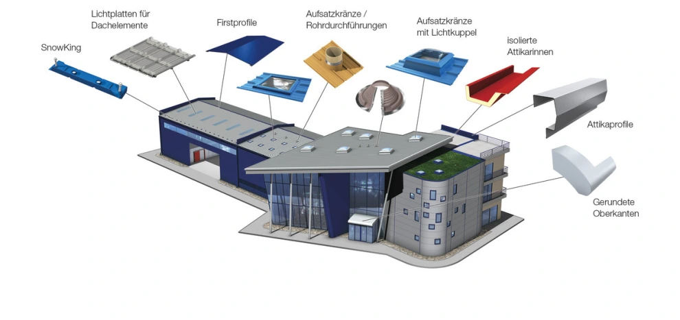 Kantteile werden aus vollverzinktem Stahl mit einer maximalen Einlaufbreite von 1.250 mm und einer maximalen Länge von 8.000 mm (empfohlene Länge für Kantteile beträgt 6.000 mm) hergestellt.