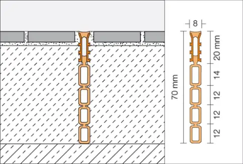 ist ein spezielles Profil aus kombiniertem Hart-/Weich-PVC und dient zur Erstellung von Dehnungsfugen in Belägen aus Klinkerplatten, Keramikfliesen, Natursteinplatten oder Kunststeinplatten, die in Mörtelverlegung verarbeitet werden. Das 70 mm hohe Profil kann durch Abtrennen einzelner Profilsegmente an die jeweilige Konstruktionshöhe angepasst werden.