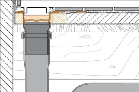 Der Klebeflansch ist mit einer Vliesoberfläche ausgestattet. Die mitgelieferte KERDI-Manschette dient als Dichtanschluss an die Flächenabdichtung. Zum dichten Anschluss im Wandbereich ist der Klebeflansch nach unten abgewinkelt und mit einem Schlüter®-KERDI-BAND ausgestattet.