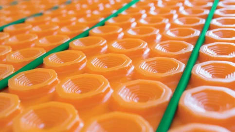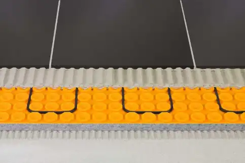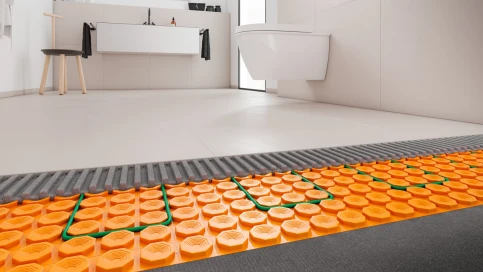 Am Boden wird Schlüter®-DITRA-HEAT-E in einem fixen Verlegeabstand von 3 Noppen verlegt. Dadurch wird eine Wärmeabgabe von 136 Watt/m2 erreicht.