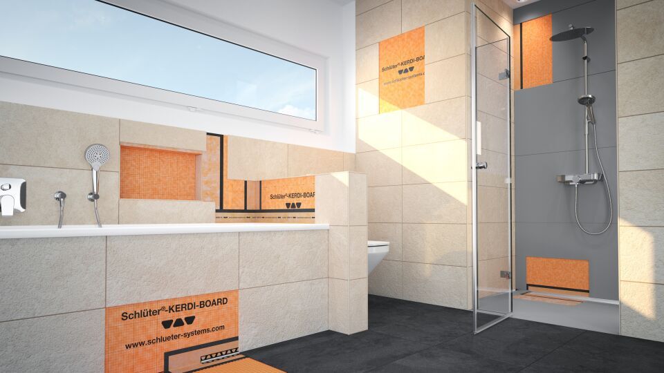 Viele Untergründe bei Neubauten und bei Sanierungsmaßnahmen sind für Fliesenbeläge nicht geeignet, besonders auch in wasserbelasteten Bereichen. Diese erfordern häufig umfangreiche Zusatzarbeiten und Abdichtungsmaßnahmen. Mit Schlüter®-KERDI-BOARD ist es sehr einfach - ob bei Mauerwerk, Ständerwerk aus Holz oder Metall, Misch-/Altuntergründen bei der Sanierung einen verlegefertigen Untergrund herzustellen.