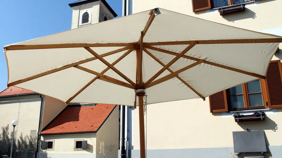 Für alle Holz-Sonnenschirme werden ausgesuchte FSC-zertifizierte Hölzer aus der EU verwendet. Die Masten haben einen Durchschnitt von 58 mm, die Maße der Streben sind 36 x 18 mm, damit sind sie sehr stabil. Das Öffnen erfolgt immer über einen 2-fach Flaschenzug, je nach Sonnenschirm Typ ergibt sich eine Tischfreiheit von 75 cm.