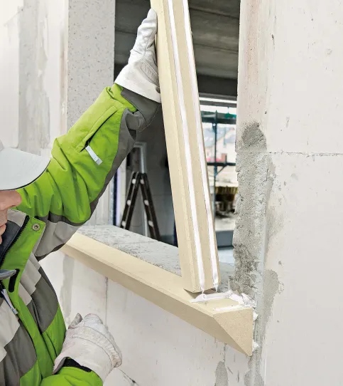Die grünen Fenstermontage-Riegel aus hochverdichtetem EPS sind die tragenden Elemente des illbruck SY002 Vorwandmontage-Systems SMART. Sie sind leicht, trotzdem sehr stabil und einfach in der Handhabung.