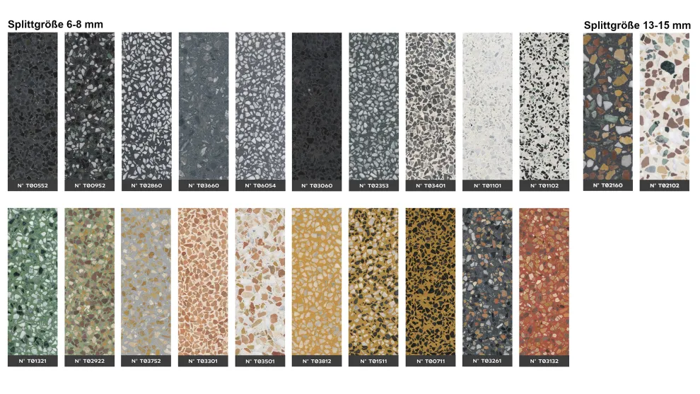 Terrazzoböden lassen sich nicht nur mit Gesteinssplitten realisieren. Denkbar sind viele Materialien, beispielsweise aus einer vorgehängten Natursteinfassade, aus Treppenbelägen oder aus Natursteinböden in Bestandsgebäuden.