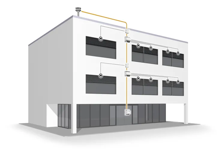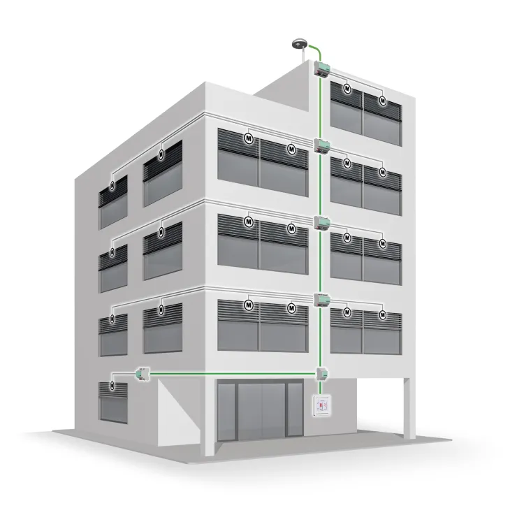 Mit Omnexo können je Zentraleinheit bis zu 500 Sonnenschutzprodukte einzeln oder 3000 Produkte in Gruppen angesteuert werden und ist damit perfekt für mittelgroße Objekt- und Zweckbauten wie Kindergärten, Schulen oder Bürogebäude geeignet. Fahrbefehle und Wetterdaten werden über die Busleitung übertragen. Die Omnexo Wetterstationen übermitteln aktuelle Wetterdaten an die Zentrale, welche die Fahrbefehle über die Busleitung weiterleitet. Jeder Aktor filtert die für ihn bestimmten Signale und löst eigenständig Fahrbefehle für alle angeschlossenen Produkte aus.