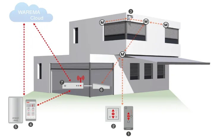 Durch das intelligente Mesh-Netzwerk werden Befehle von Empfänger zu Empfänger weitergeleitet, wodurch auch weit entfernte Produkte erreicht werden. Dies ermöglicht eine ausfallsichere Verteilung des Funksignals zwischen den Sendern (z. B. Smartphone, Handsender, Wandsender) und den Empfängern (z. B. WMS Funkmotor, Zwischenstecker). Für eine automatische Steuerung nach Helligkeit und Wetterlage sorgen die cleveren Messwertgeber. Die empfangenen und ausgeführten Befehle werden von den Empfängern bestätigt und an die Sender zurückgemeldet.