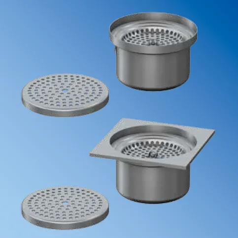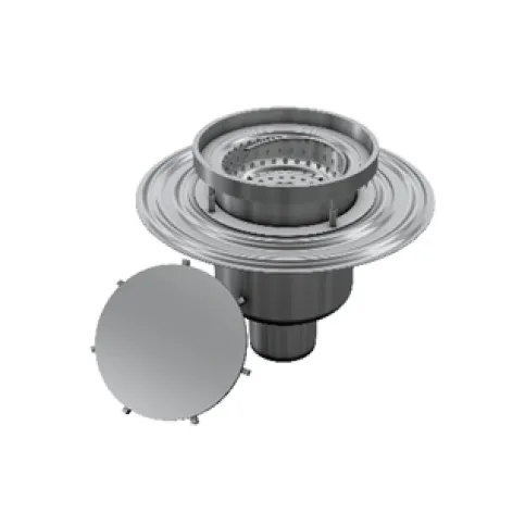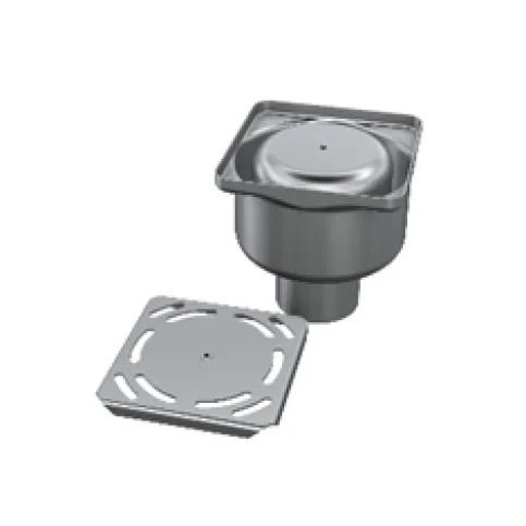 Industriebodeneinlauf, einteilig, Modell 2001, entsprechend EN 1253. Bodeneinlauf Nennweite 100 mit sehr geringer Einbauhöhe, die anschließende Rohrmuffe befindet sich in der Höhe der Wasservorlage. Um einen großen Selbstreinigungseffekt zu erzielen, hat der Gehäuseboden große und tiefgezogene Innenradien. Eingeschweißtes Standrohr mit wartungsfreiem Glockengeruchsverschluss (ohne Dichtung) und Flachkorb aus Edelstahl. Senkrechter Ablaufstutzen. Oberfläche VA-korngestrahlt/gebeizt.