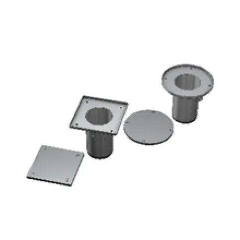 Höhenverstellbarer Industriebodeneinlauf, zweiteilig, Modell H, entsprechend EN 1253. Aufsatzstück stufenlos höhenverstell- und verdrehbar, ohne Dichtring. Einlaufrand aus Vollmaterial 25x8 mm, Klebeflansch am Bodeneinlauf-Unterteil. Um einen großen Selbstreinigungseffekt zu erzielen, hat der Gehäuseboden große und tiefgezogene Innenradien. Eingeschweißtes Standrohr mit wartungsfreiem Glockengeruchsverschluss (ohne Dichtung) und Lochblechschlammfang aus Edelstahl. Senkrechter Ablaufstutzen. Oberfläche VA-korngestrahlt/gebeizt.