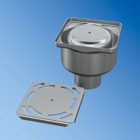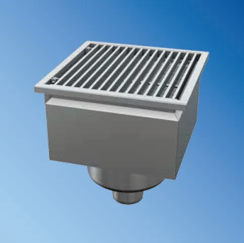 Eingeschweißtes Standrohr mit wartungsfreiem Glockengeruchsverschluss (ohne Dichtung) und Lochblechschlammfang aus Edelstahl. Senkrechter Ablaufstutzen. Oberfläche VA-korngestrahlt/gebeizt.