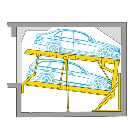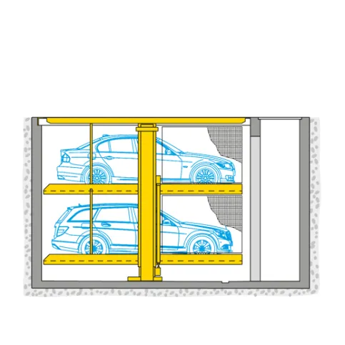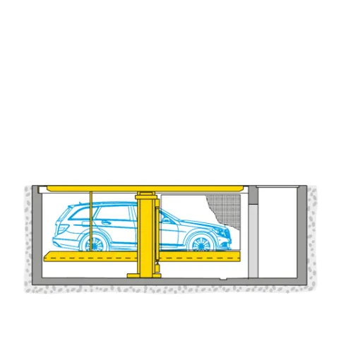 Das halbautomatische Parksystem mit 2 Parkebenen ohne Grube für unabhängiges Parken. Durch die Technik des Verschiebepuzzelns und einem Leerplatz in der Einfahrtsebene werden alle Stellplätze direkt über die Einfahrebene angefahren. Um ein Auto auf der oberen Stellplatzebene abzusenken, werden die Stellplätze in der unteren Ebene seitlich so verschoben, dass der Leerplatz unter dem angewählten Stellplatz ist.