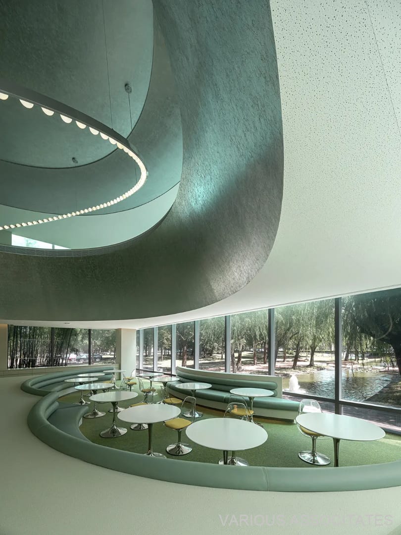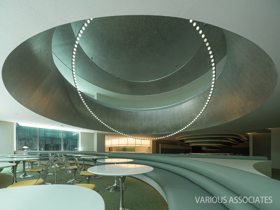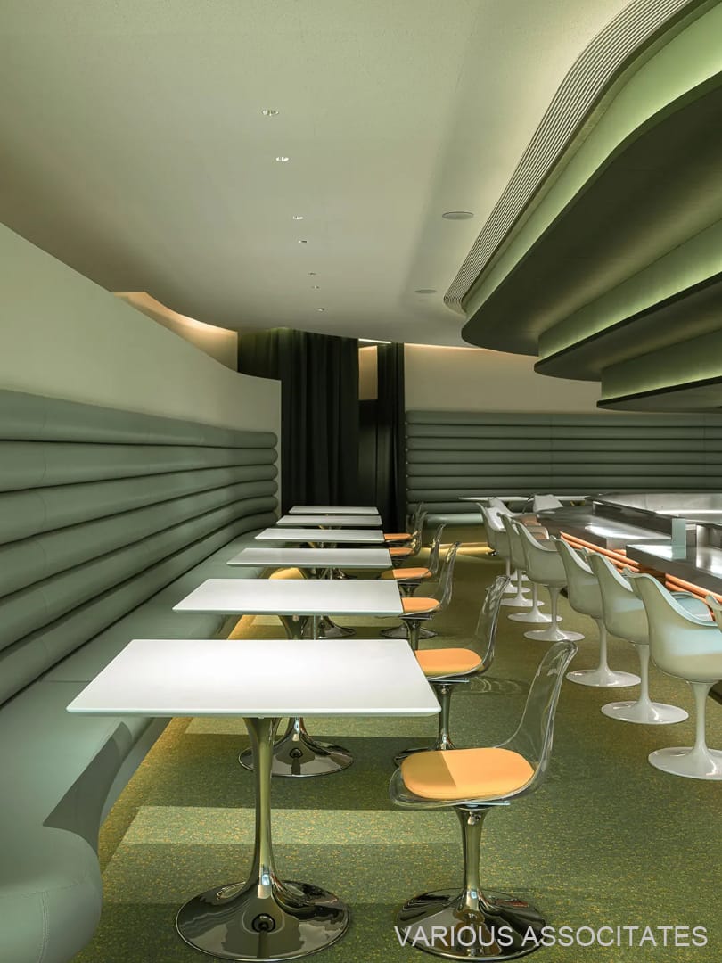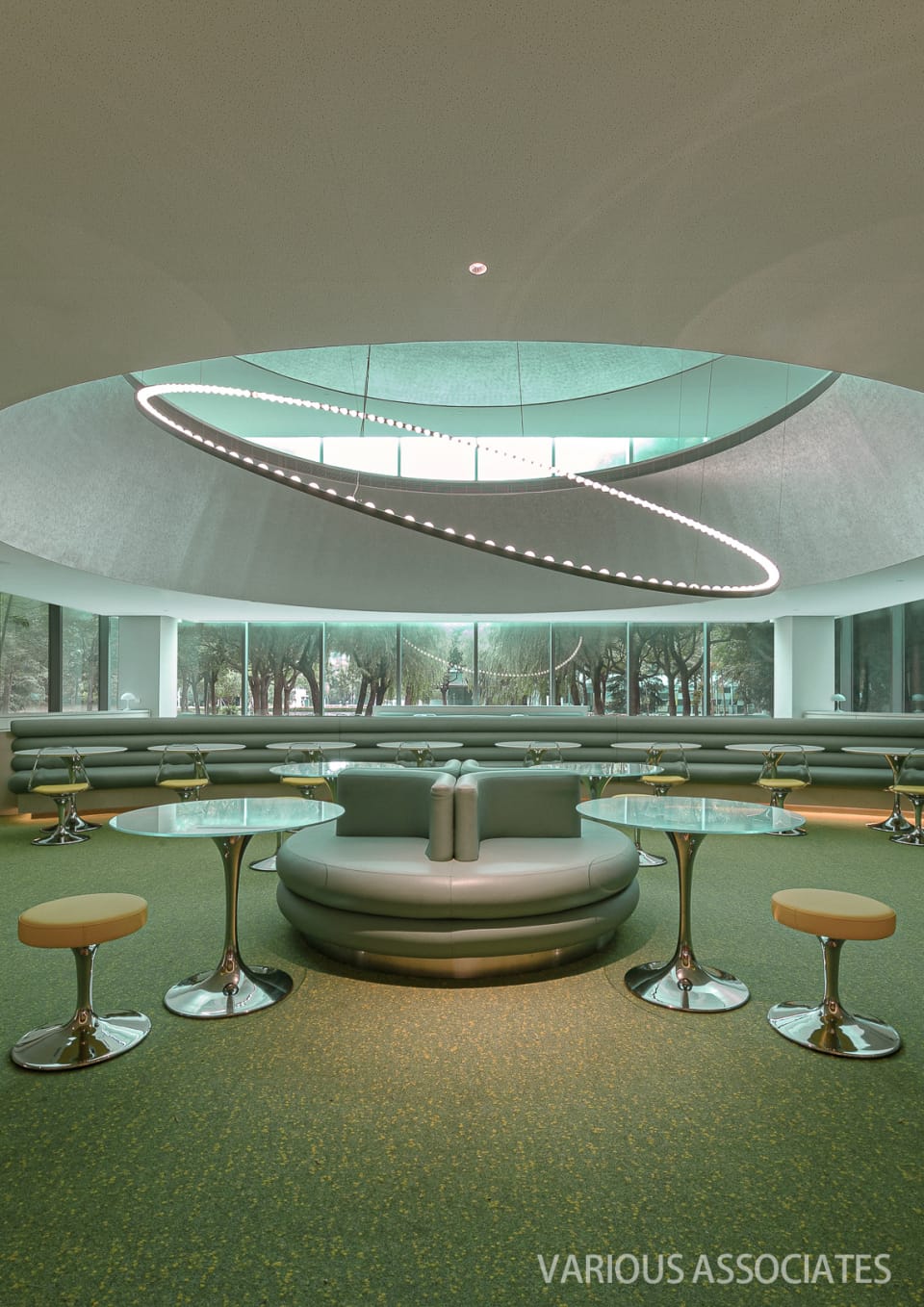 Für die Kombination aus Restaurant und Wartebereich wünschte sich der Bauherr eine futuristische Raumatmosphäre. Entsprechend nutzen die Architekten von Various Associates Elemente, die mit der Vorstellung der Zukunft assoziiert werden, um eine intuitiv futuristische Szenerie zu erschaffen: Geometrische Formen wie Kreise, Kurven und Kugeln werden auf Innenstrukturen, Oberflächen und Möbel angewandt und erinnern an die Umlaufbahnen der Planeten. Die Ideen der „Wartehalle“ und des „Countdowns“ werden mit dem Blick auf eine verheißungsvolle Zukunft erlebbar gemacht. Das Projektdesign orientiert sich dabei an den ästhetischen Errungenschaften des 20. Jahrhunderts und zitiert gekonnt Filmklassiker wie Stanley Kubricks „2001“ und das ikonische TWA Flight Center am Flughafen John F. Kennedy in New York. Im Zentrum des öffentlichen Bereiches befindet sich die langgestreckte Kaffeebar mit Stühlen und einem auffälligen, beleuchteten Baldachin. Dahinter befindet sich eine große Cocktailbar mit Schalensitzen, die auf allen Seiten von weiteren Sitzgelegenheiten und vier halbprivaten Kabinen flankiert wird. Das gesamte Gebäude ist in einen sanften grau-grünen Farbton getaucht, der von einer Vielzahl von Materialien wie Kunstharz, Glaspaneelen und hochglanzpoliertem Stahl eingefangen wird und dem ATLATL eine anspruchsvolle visuelle Schichtung verleiht. Symbolisch verankert wird das Designthema durch einen scheinbar schwebenden, mit Glühbirnen besetzten Ring im Atrium. Dieser zieht sich über den unteren und oberen Bereich des Gebäudes hinweg und grenzt den Essbereich ab, der auf einen ruhigen Garten hinausschaut.