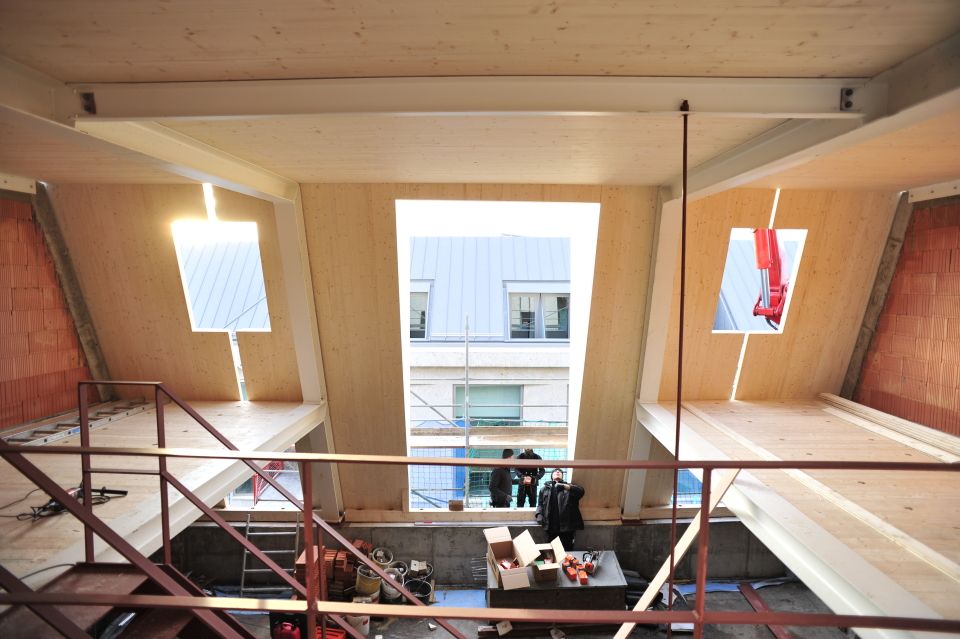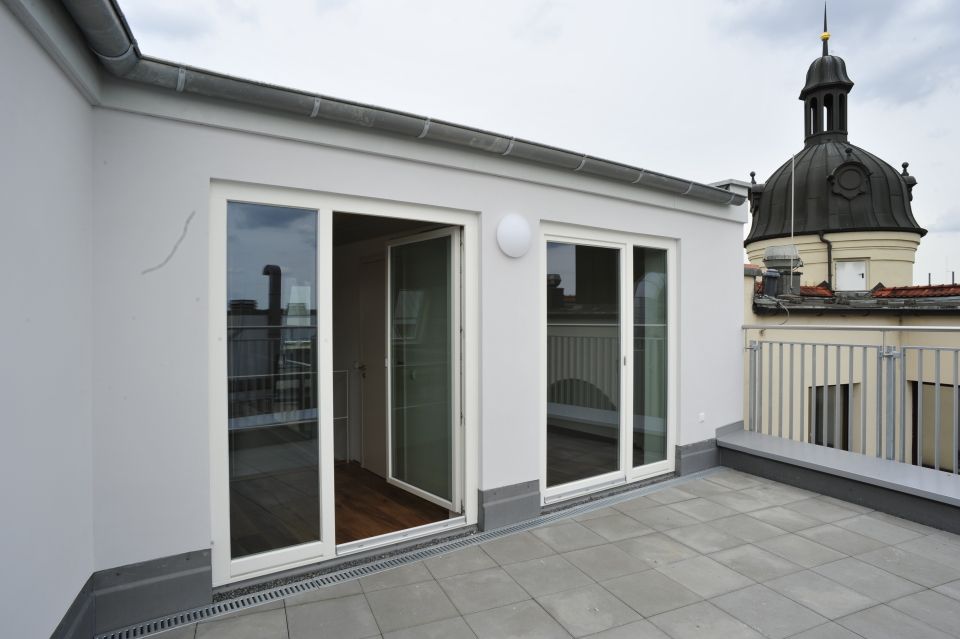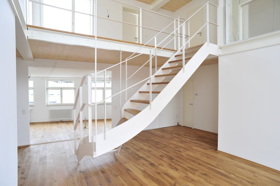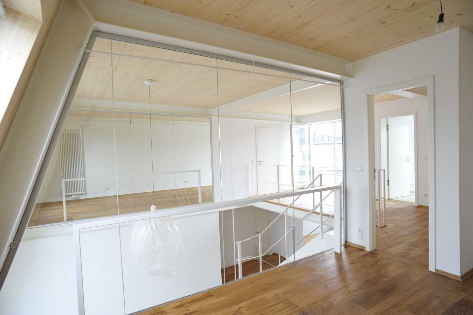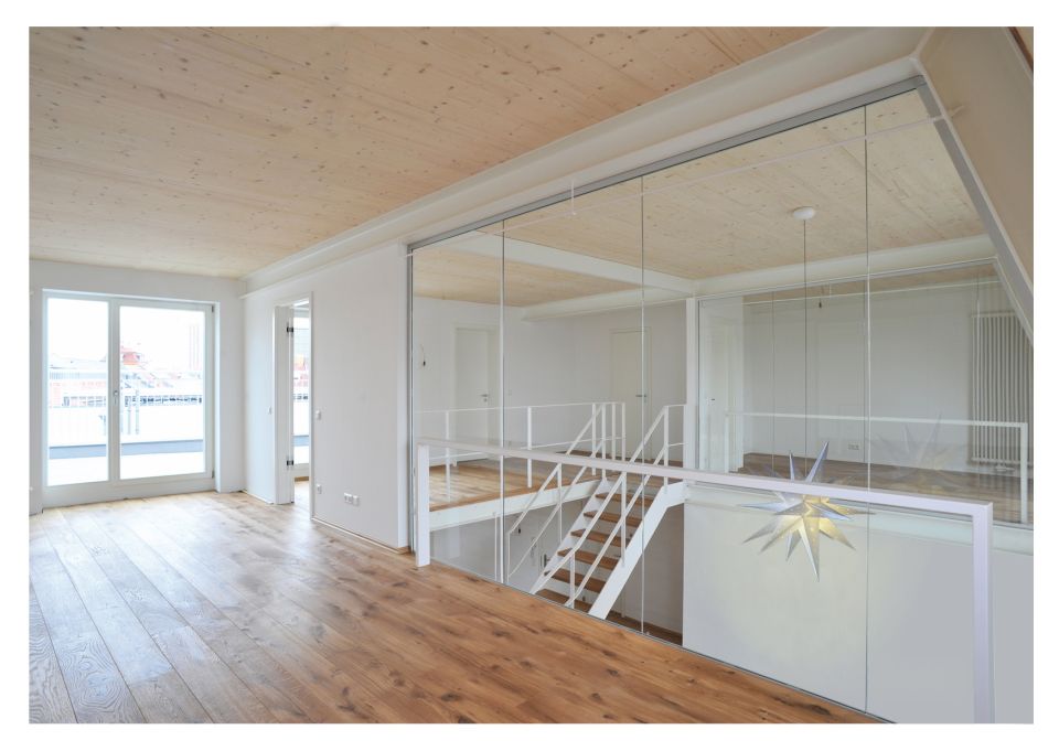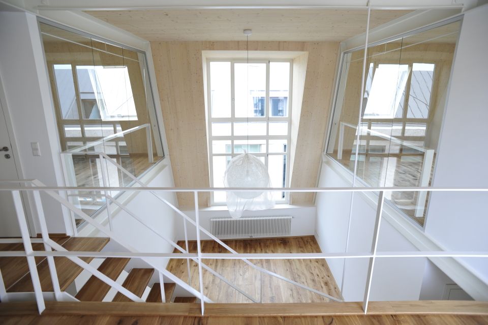 Brettsperrholzplatten zeitgemäß ersetzt. Entstanden ist ein 2-geschossiges, lichtdurchflutetes Penthouse mit Dachterrasse. Der Grundriss folgt dem Prinzip eines