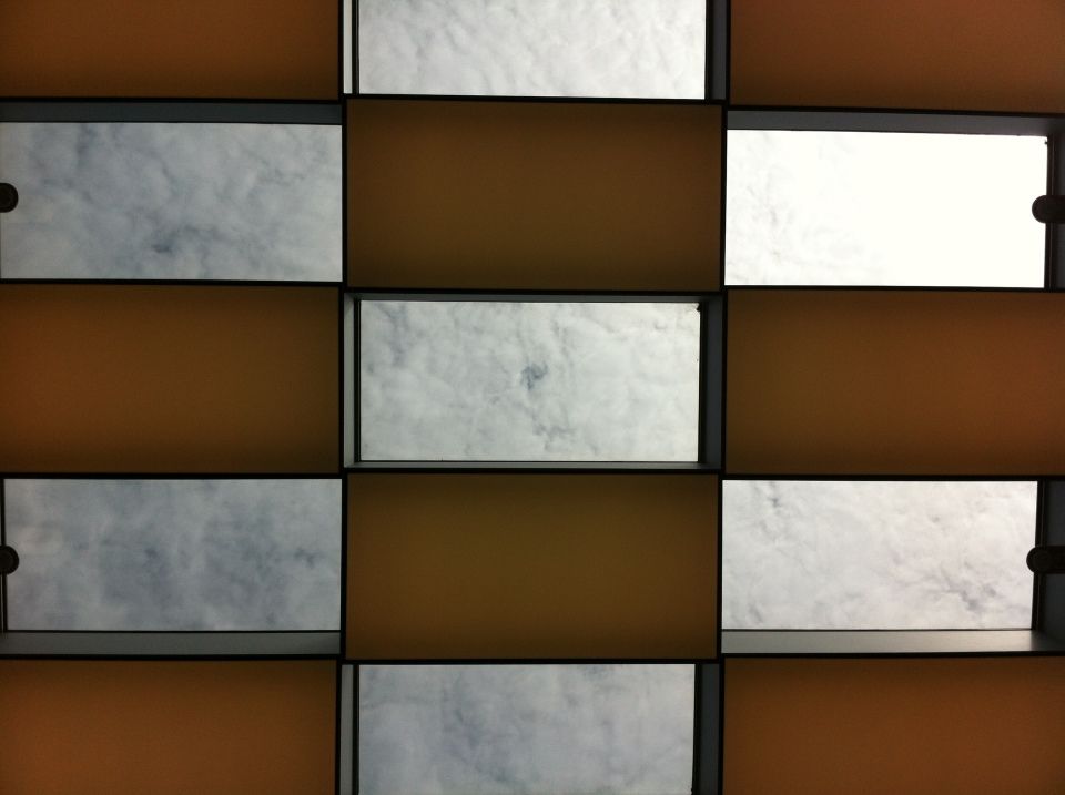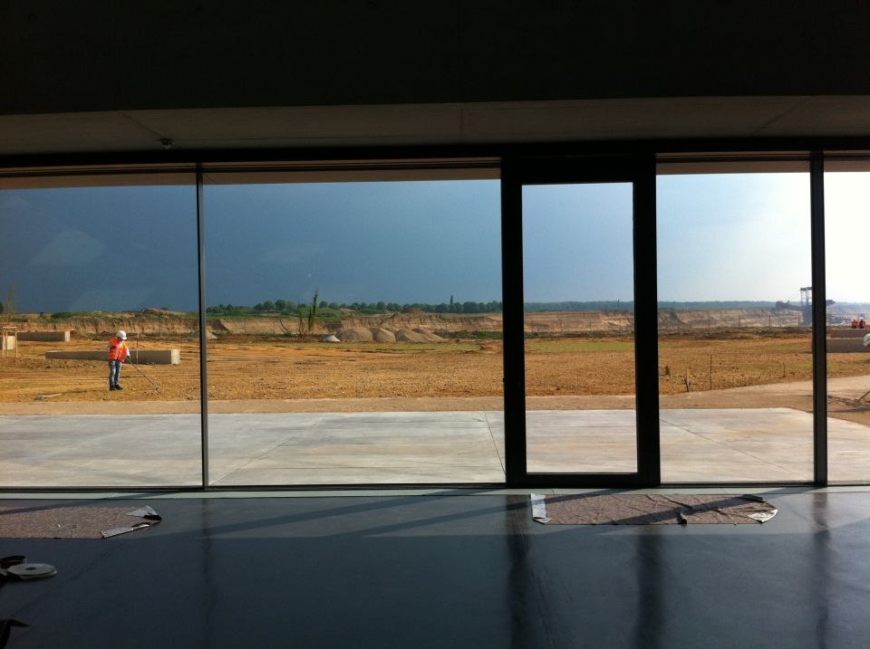 Zurückgekehrt ins Bistro erblickt der Besucher die Weite des Tagbaus – denn die Glaswand des Atriums lässt sich an der Tagebauseite 12 Meter weit zur Freiterrasse öffnen. Hier bietet sich ein Panorama weit hinaus über die von Dünen gerahmte Freifläche und die Tagebaukante; abends kann man ideal den Sonnenuntergang über dem Tagebau verfolgen, und eines Tages auch über dem Hambacher See.