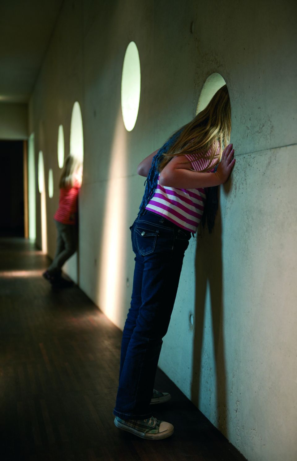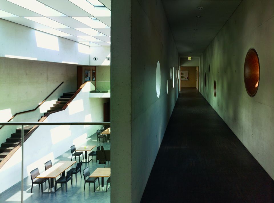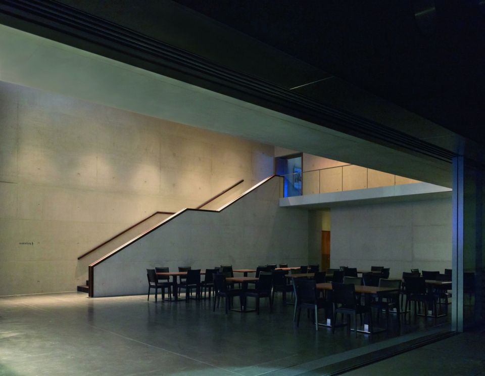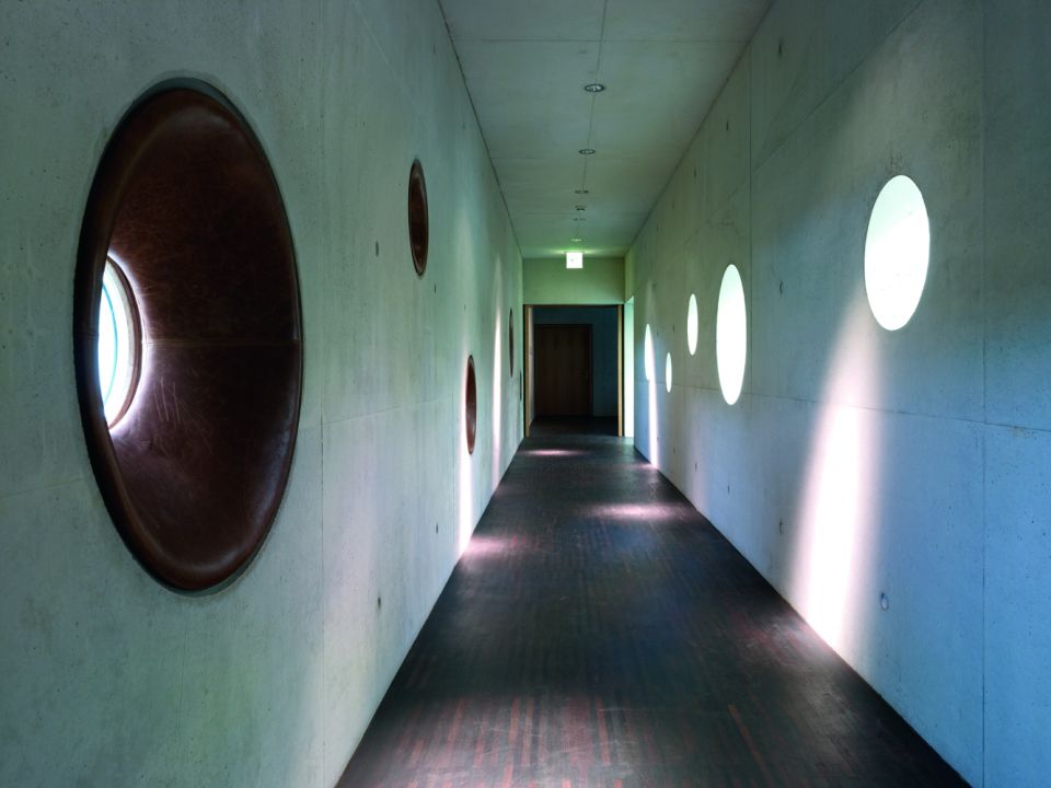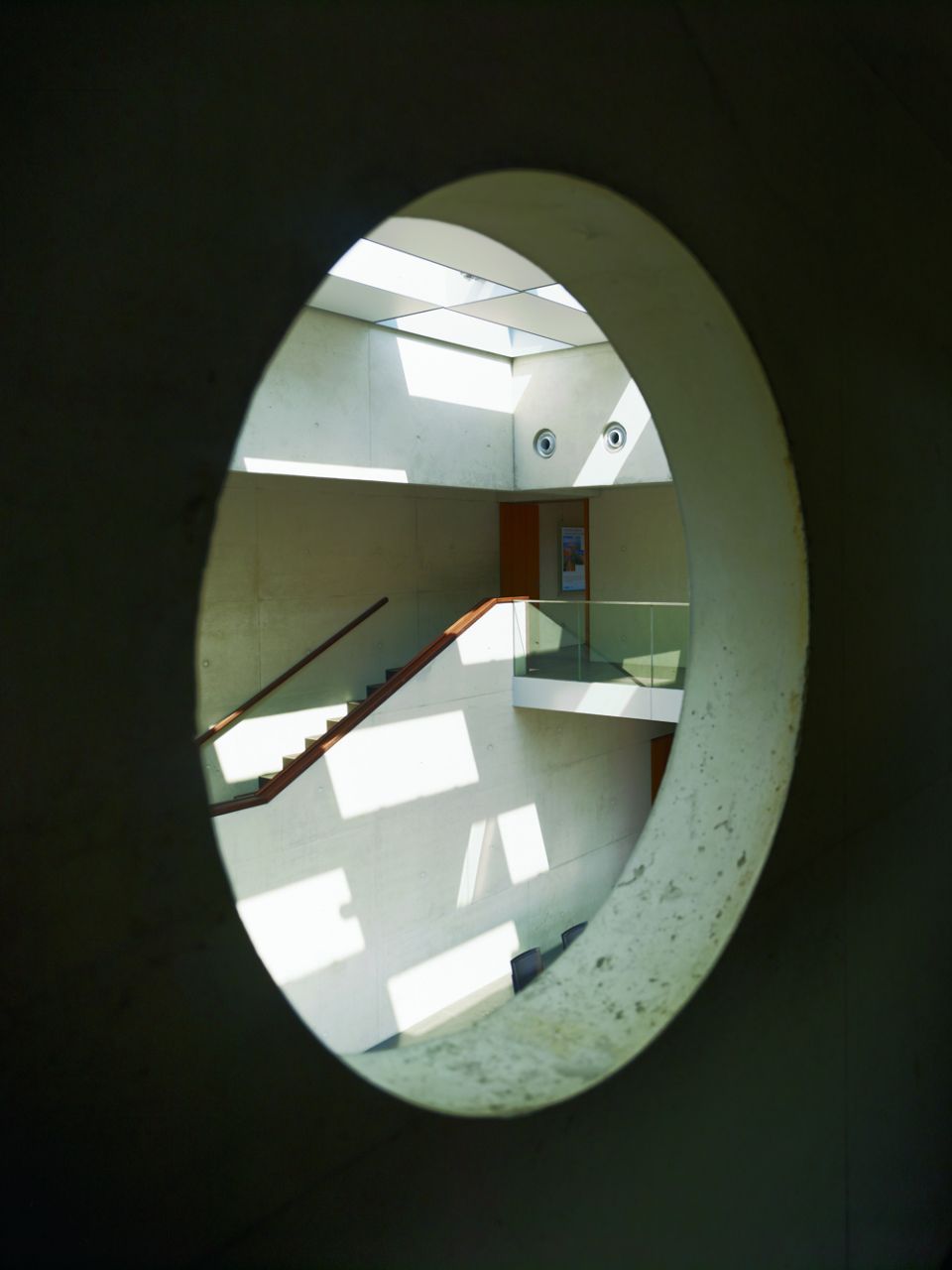 Der für die Fassade verwendete Beton wurde daher vor seiner Verarbeitung mit unterschiedlichen Farbpigmenten entsprechend den wechselnden Erdschichtfarben versetzt. Um den Eindruck eines steinernen Blocks zu verstärken, ließen wir die Fassade nach ihrer Fertigstellung fräsen, wodurch sie ihre charakteristische raue Textur erhielt.