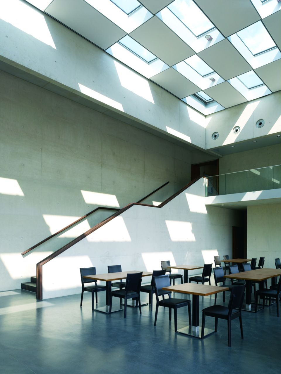 Ganz anders das Innere: im Gegensatz zu den rauhen Außenflächen findet man hier exakt geschalte, glatte Sichtbetonoberflächen, ergänzt durch sorgfältig eingefügte Einbauten aus Holz und Glas. Durchgehende Bodenflächen, im Obergeschoss aus dunklem Parkett, im Erdgeschoss aus einem dunkel gespachtelten Estrich verstärken den Eindruck fließender Raumübergänge.