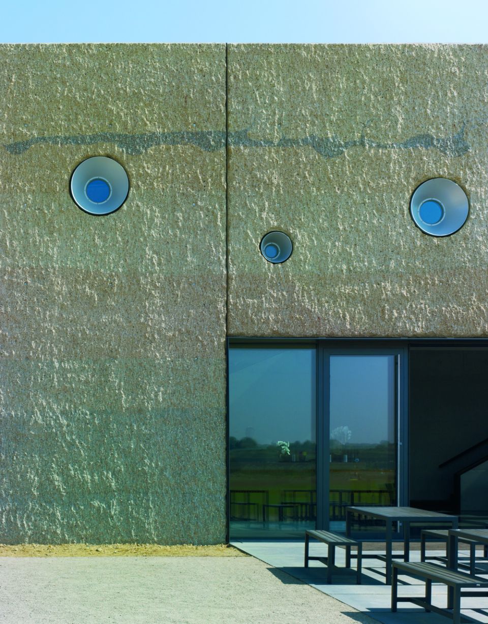 Mit seinen spielerisch angeordneten Rundfenstern innerhalb einer ansonsten geschlossenen, nüchternen Kubatur sucht das Gebäude die Balance zwischen Zurückhaltung und der einladenden Offenheit eines Informationszentrums. Seine quaderartige, massive Struktur hat indes auch konstruktive Gründe: Es galt, eine in sich steife "Kiste" zu bauen, die auf 14 nachjustierbaren Einzelfundamenten in der Waage gehalten wird, sollte es infolge der Tagebauaktivitäten zu Erdbewegungen kommen. Das Haus steht in unmittelbarer Nähe der Tagbaukante, die normalerweise nicht bebaut werden darf.