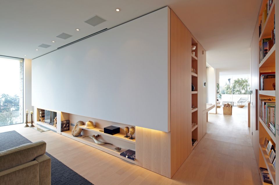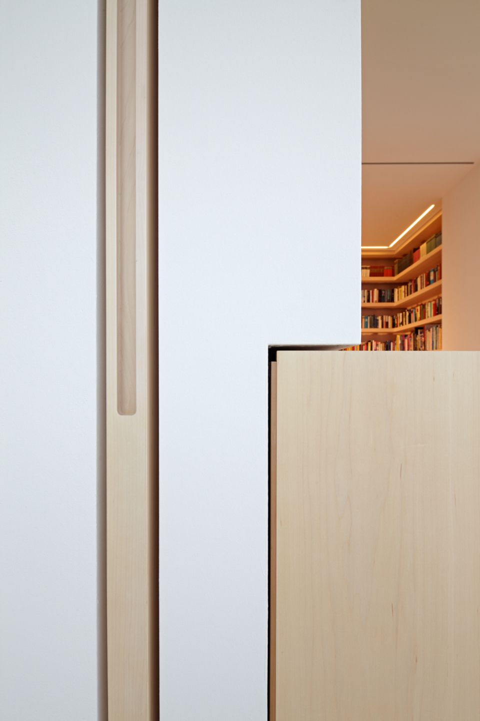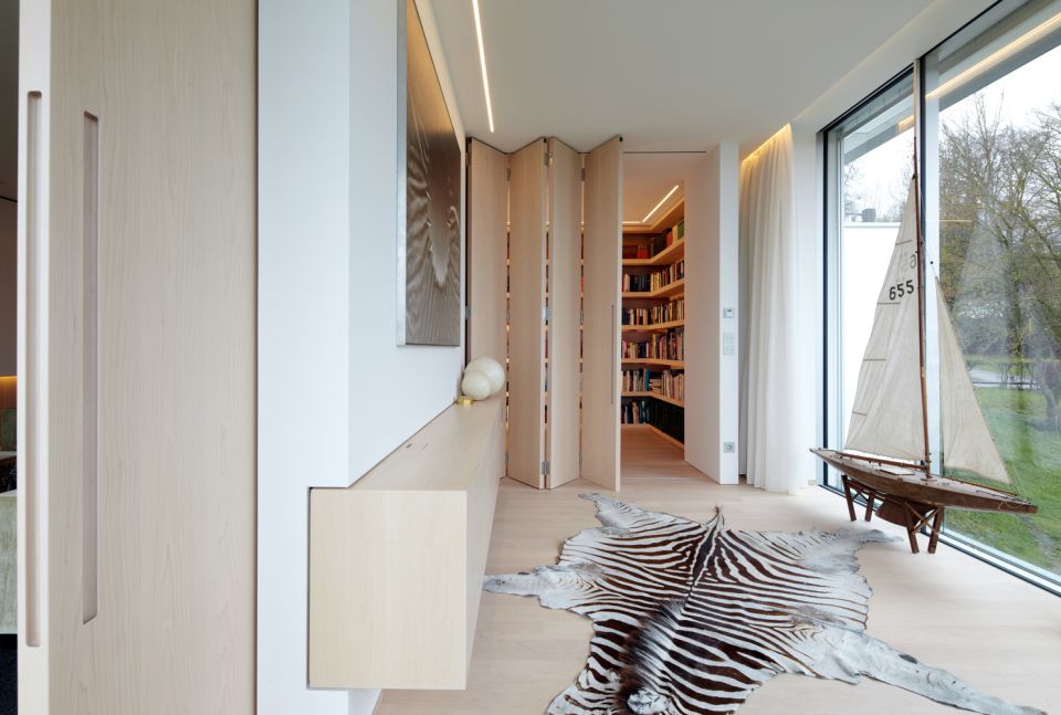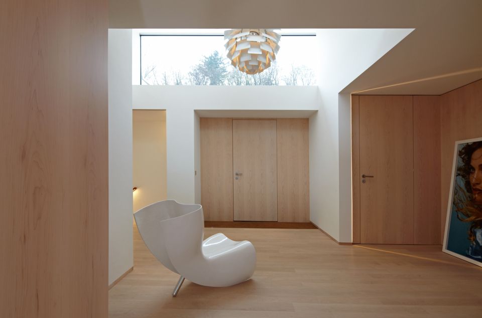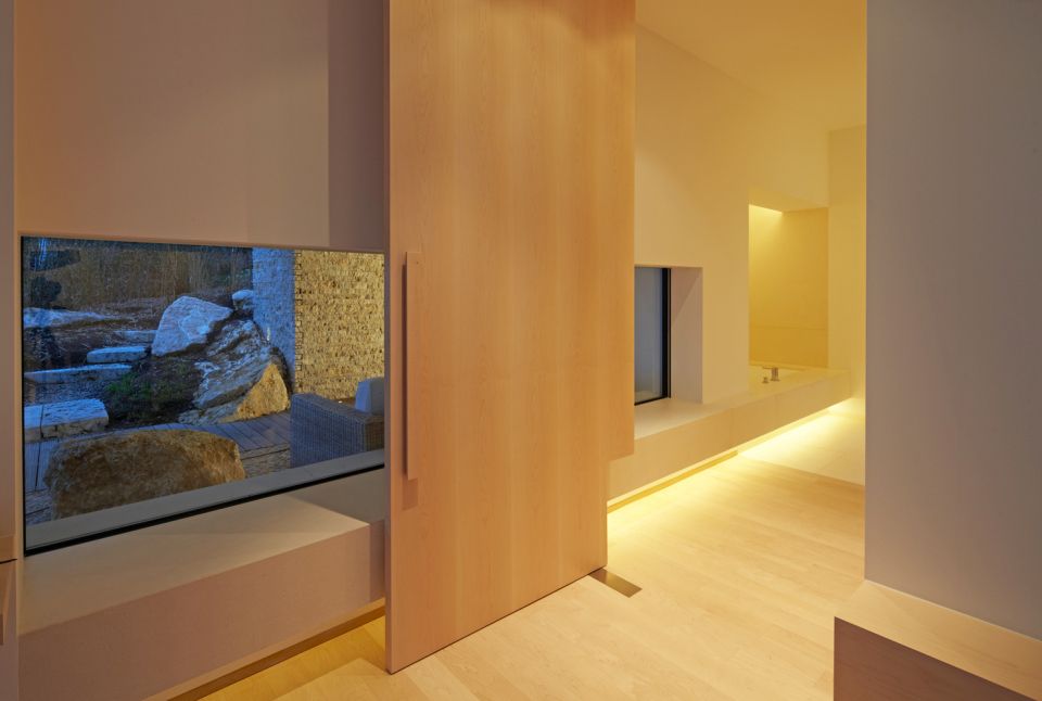 Der entgrenzte Raum und der subtile Übergang zwischen Innen und Außen, das Spiel zwischen Offen und Geschlossen, von Weite und Geborgenheit entsprechen der Lebens und Arbeitswelt der weitgereisten Bauherrn. Raumhöhe Möbeleinbauten mit 7 mm Schattenfuge zum Boden und Decke nehmen alle Innentüren in Paneel artigen Vertiefungen oder SchiebtürTaschen auf und unterstützen im offenen Zustand das Raumkontinuum.