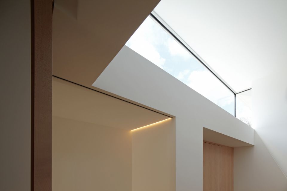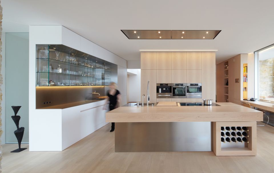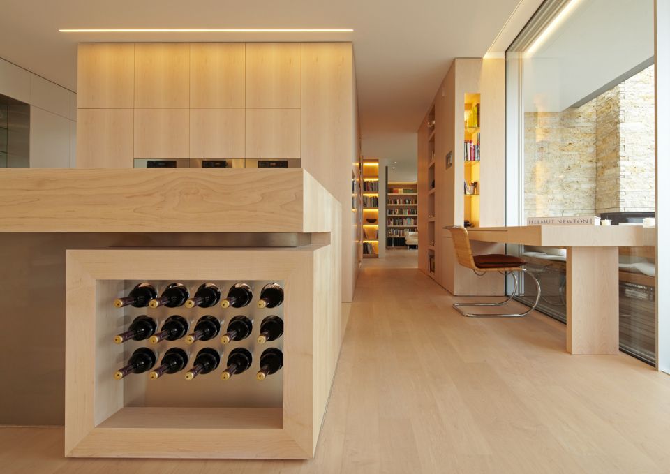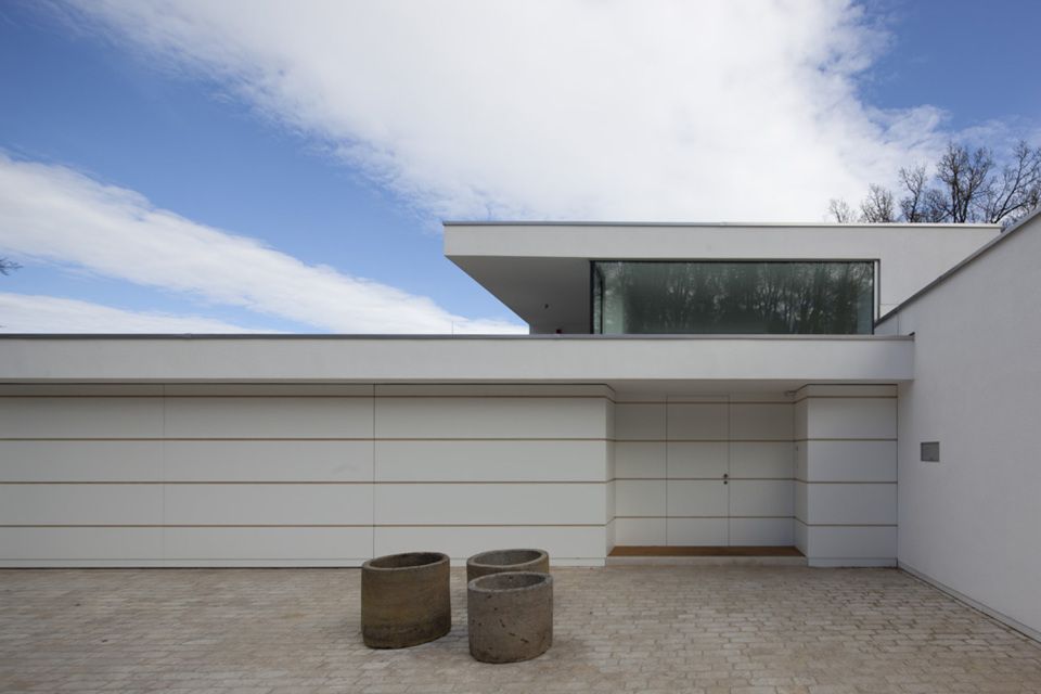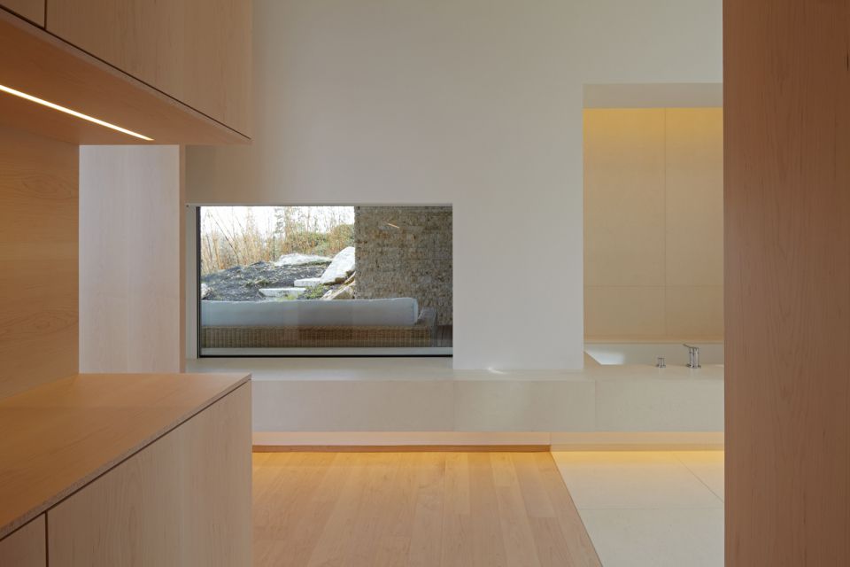 Der entgrenzte Raum und der subtile Übergang zwischen Innen und Außen, das Spiel zwischen Offen und Geschlossen, von Weite und Geborgenheit entsprechen der Lebens und Arbeitswelt der weitgereisten Bauherrn. Raumhöhe Möbeleinbauten mit 7 mm Schattenfuge zum Boden und Decke nehmen alle Innentüren in Paneel artigen Vertiefungen oder SchiebtürTaschen auf und unterstützen im offenen Zustand das Raumkontinuum.