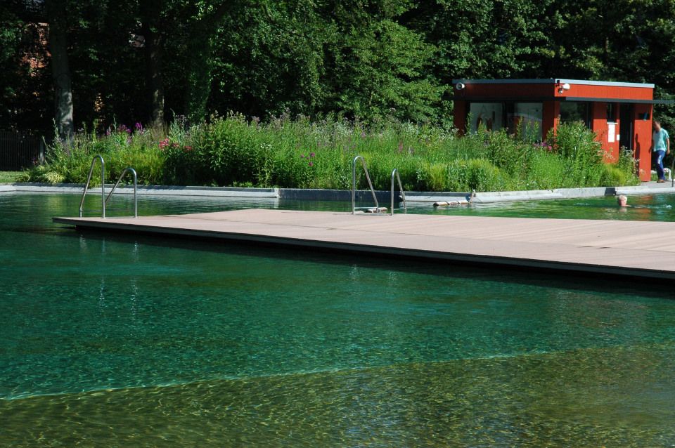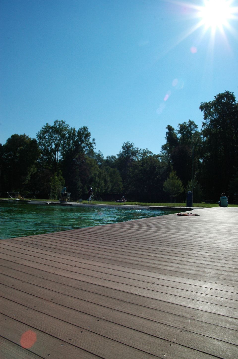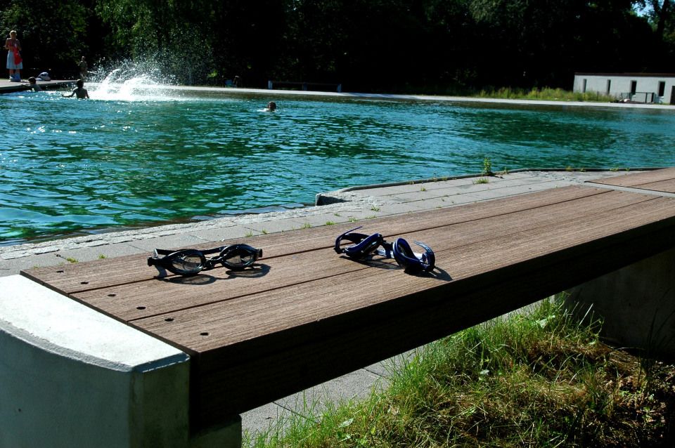 Das Naturbad Maria Einsiedel in München integriert sich harmonisch in die Umgebung. Durch das idyllische Sommerbad fließt die Isar und kann zum Baden genutzt werden. Zahlreiche idyllische Liegewiesen mit schattenspendenden Bäumen laden zum Entspannen ein. Für den großen Schwimmteich hat die Stadt München etwas besonderes in Auftrag gegeben: Das auf vollbiologisch spezialisierte Planungsbüro Grafinger plante einen sich selbst reinigenden Schwimmteich mit großzügiger ins Wasser hineingehender Liegefläche. Für die Liegefläche wurden die bildschönen und splitterfreien Designdielen von MYDECK verwendet, die sich ideal in das Konzept integrieren und mit langjähriger Gewährleistung gegen Reißen, Fäule, Moder, Splittern und Spalten nicht nur von planerischer Seite attraktiv sind, sondern formschön auch für eine attraktive Liegefläche sorgen.