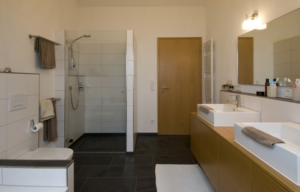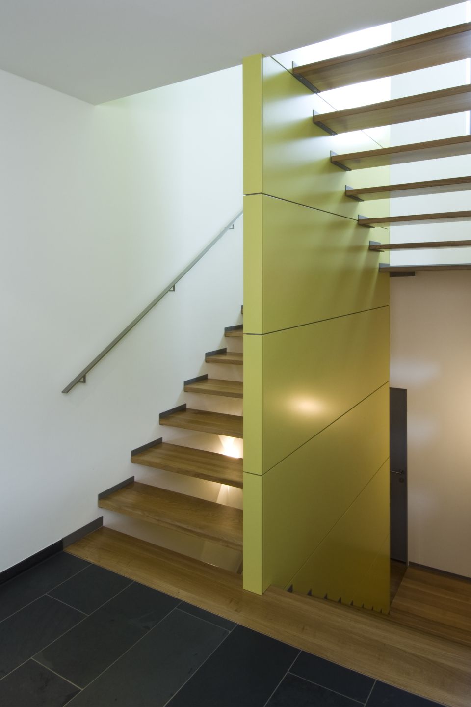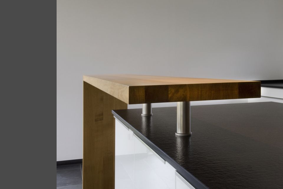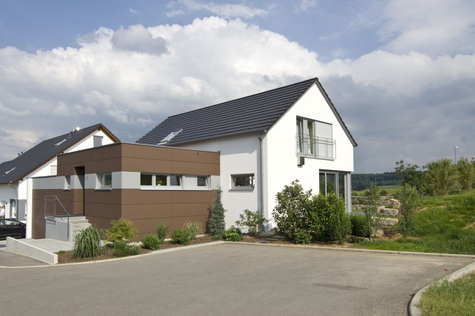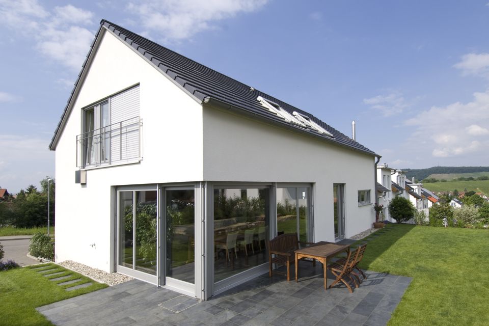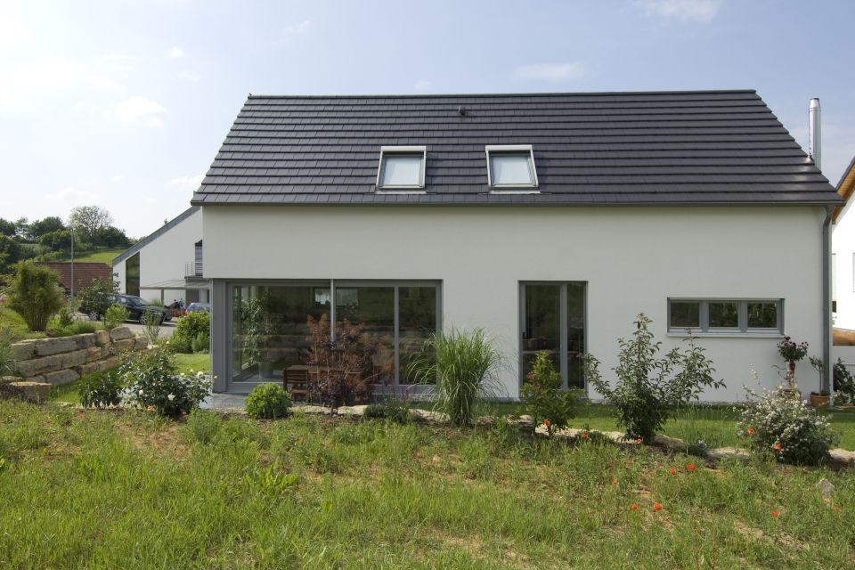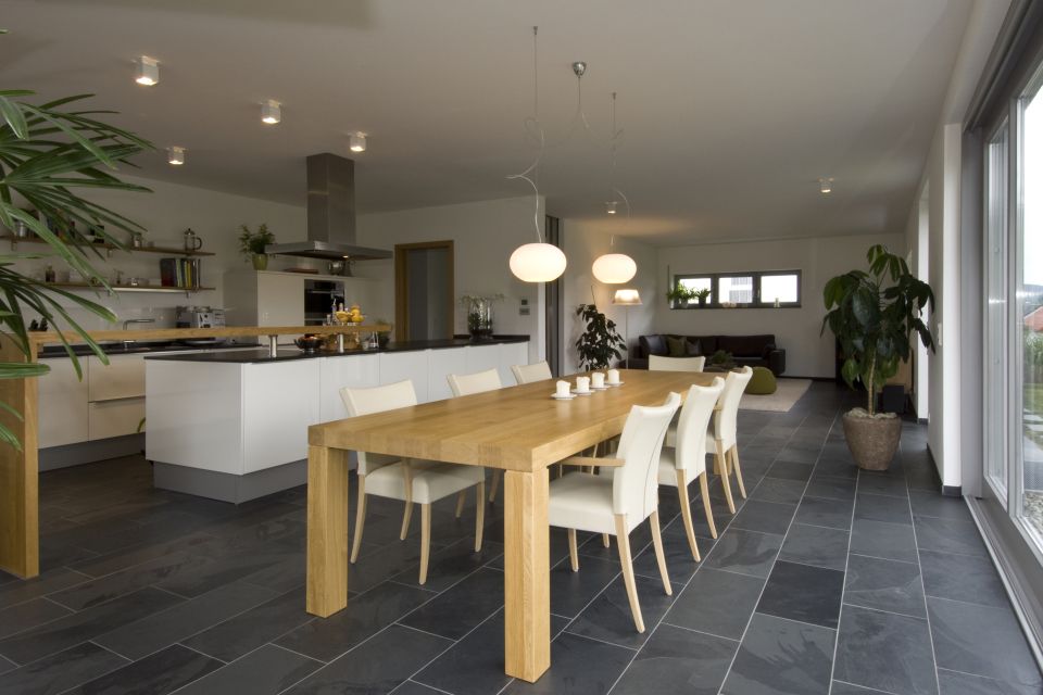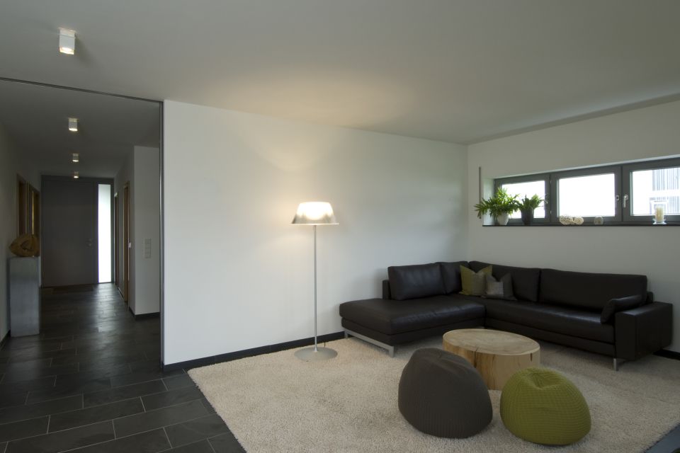 Während das Wohnhaus zur Straße relativ geschlossen auftritt, öffnet es sich nach Süden mit großen Verglasungen einer weiten, mit grauem Schiefer gestalteten Terrassenfläche, und vor allem dem wunderschönen Weitblick in die Hügellandschaften von Flein. Der fließende Übergang von drinnen nach draußen wird nicht nur durch großzügige Öffnungsmöglichkeiten gefördert, sondern vor allem durch ein Weiterführen des Schieferbelags durch die gesamte Wohnzone des Erdgeschosses, der als offenes Raumkontinuum der Funktionen Wohnen, Essen und Kochen konzipiert ist. Hochwertigste Innenarchitektur mit zahlreichen innovativen Details und einer konsequent klaren Linienführung zeichnen dieses Wohnhaus aus.