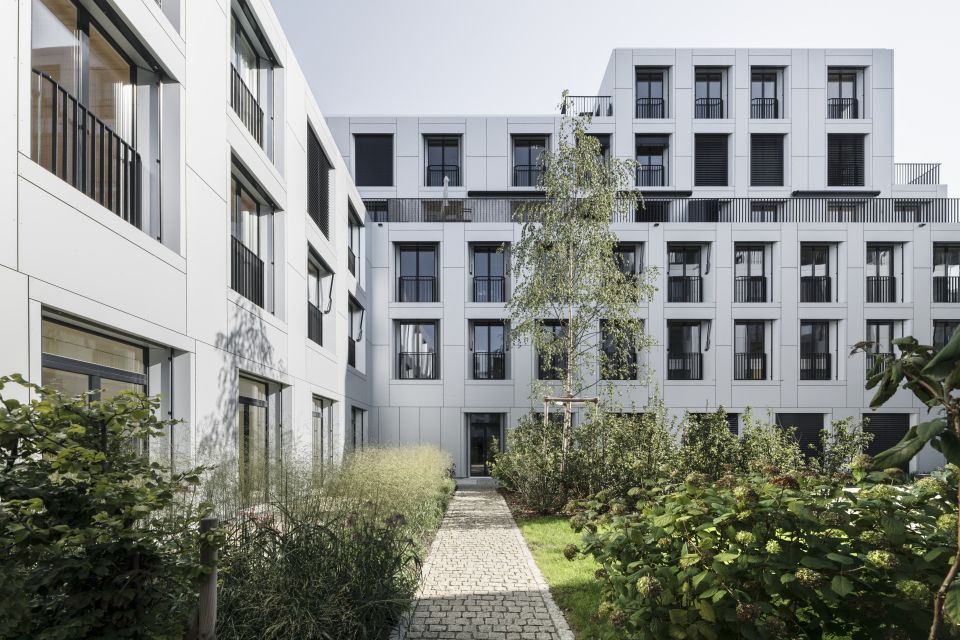 Als städtebauliche Setzung wurde eine Blockrandfigur entwickelt, die den städtischen Pocketpark an der Sulzer-Allee freispielt, einen in drei Bereiche gegliederten Innenhof definiert und den Schlussstein des sogenannten Hybrid Clusters bildet.