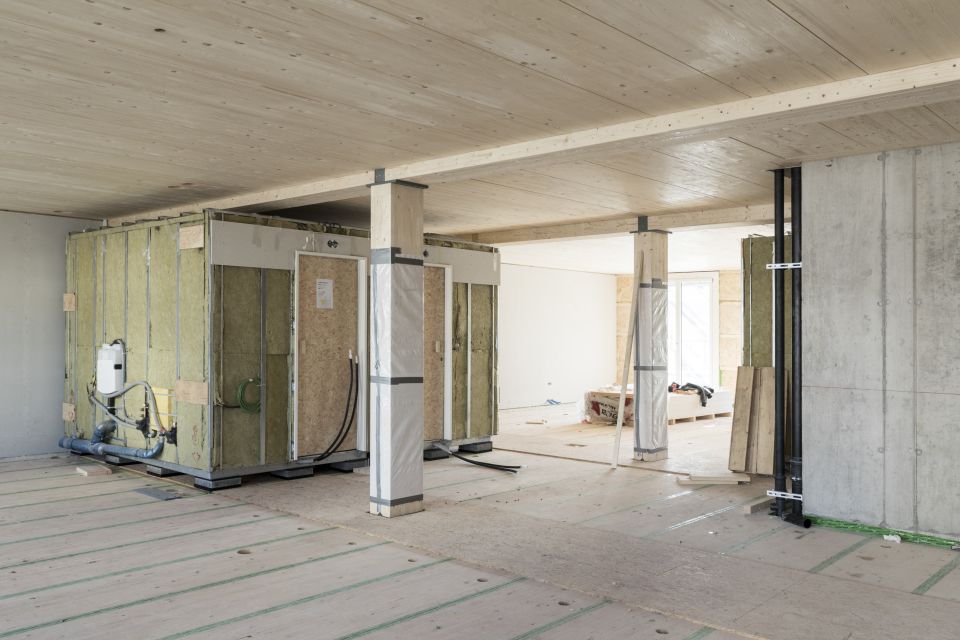 Untergeschoss, Erdgeschoss und Treppenkerne sind in Massivbauweise erstellt. Die übrigen Geschosse und die Fassade sind in Holzbauweise mit vier Tragachsen