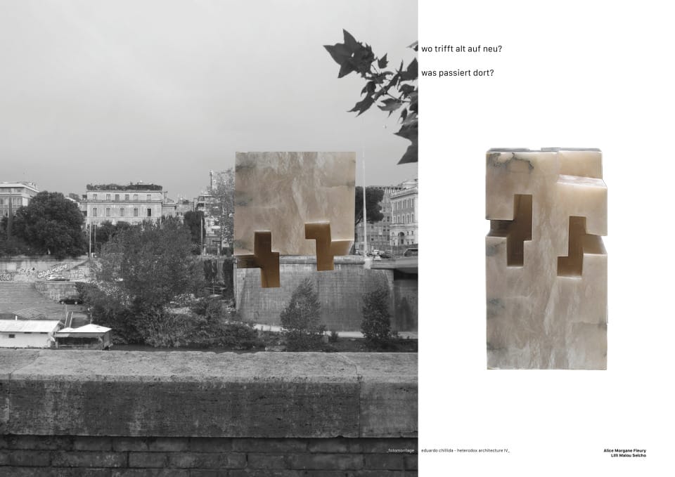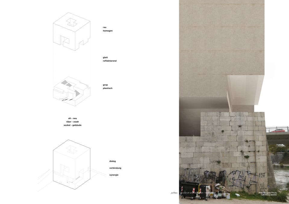 Das Projekt macht sich den vorgefundenen plastischen Sockel der Kaimauer zum volumetrischen Ausgangspunkt des Entwurfes. Der historische Fußabdruck wird vertikal um ein rohes kubisches Volumen ergänzt. Die rustikale und grobe Kaimauer aus Travertin wird um den monolithisch-rauen, sandgestrahlten Betonkubus erweitert. Die Oberflächen bilden die schroffe städtische Haut der beiden Körper. Die Oberflächen verkörpern die Massivität ihres Volumens und ihrer Beschaffenheit.