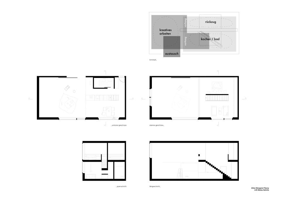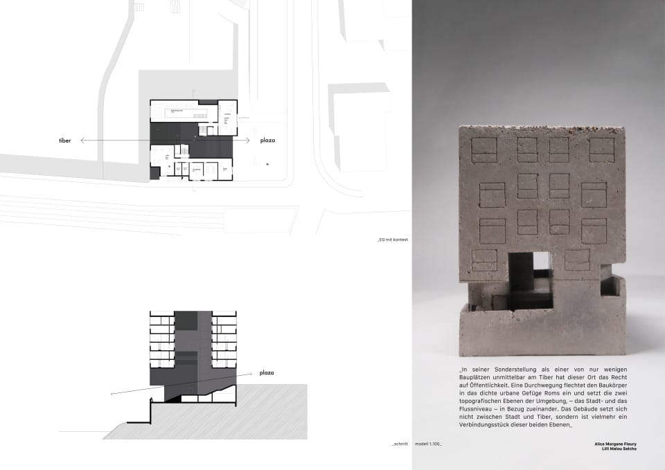 In seiner Sonderstellung als einer von nur wenigen Bauplätzen unmittelbar am Tiber hat dieser Ort das Recht auf Öffentlichkeit. Eine Durchwegung flechtet den Baukörper in das dichte urbane Gefüge Roms ein und setzt die zwei topografischen Ebenen der Umgebung, – das Stadt- und das Flussniveau – in Bezug zueinander. Das Gebäude setzt sich nicht zwischen Stadt und Tiber, sondern ist vielmehr ein Verbindungsstück dieser beiden Ebenen.
