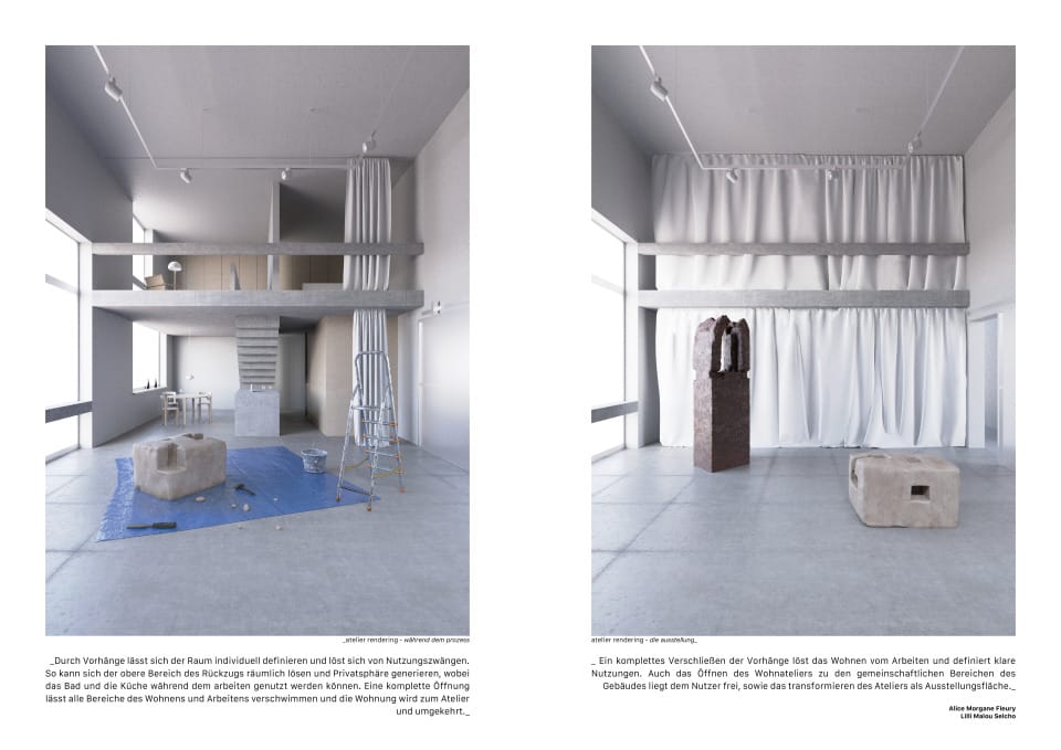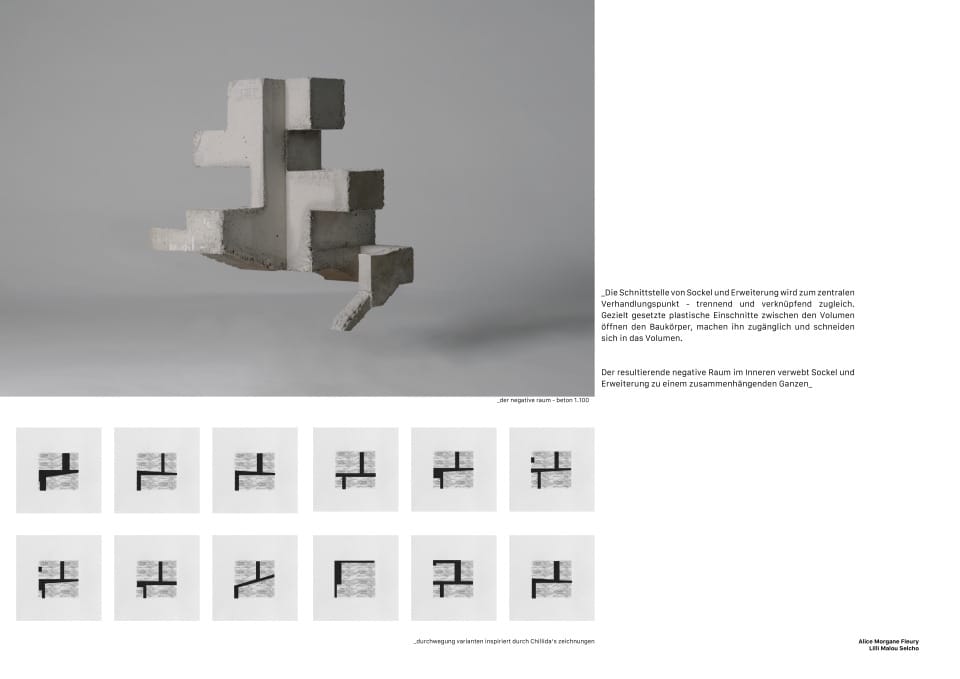 Die Schnittstelle von Sockel und Erweiterung wird zum zentralen Verhandlungspunkt - trennend und verknüpfend zugleich. Gezielt gesetzte plastische Einschnitte zwischen den Volumen öffnen den Baukörper, machen ihn zugänglich und schneiden sich in das Volumen.