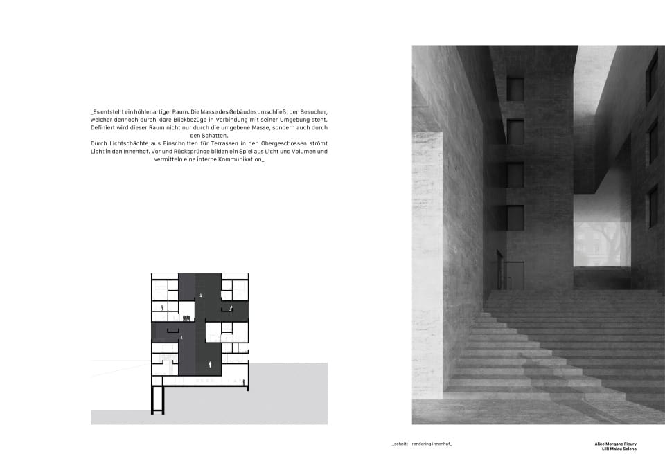 Durch Lichtschächte aus Einschnitten für Terrassen in den Obergeschossen strömt Licht in den Innenhof. Vor und Rücksprünge bilden ein Spiel mit Licht und Volumen und vermitteln eine interne Kommunikation.