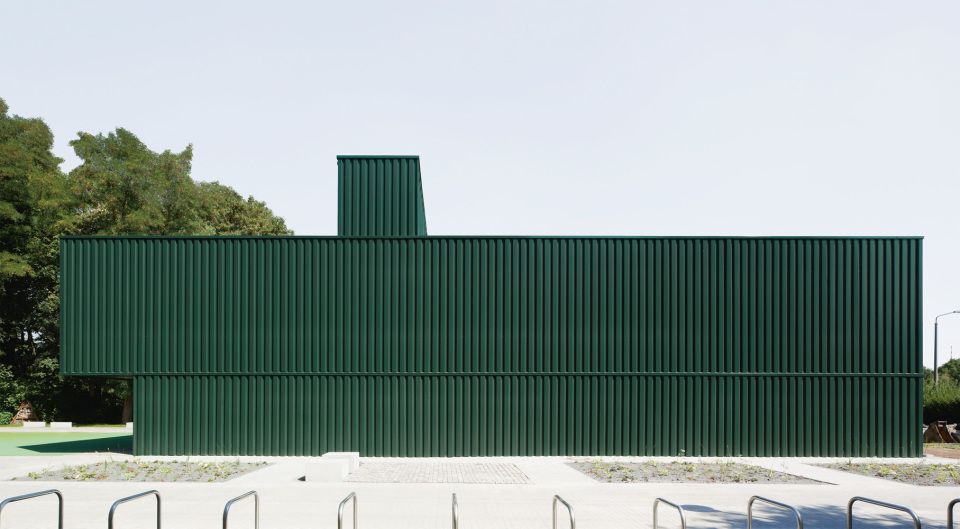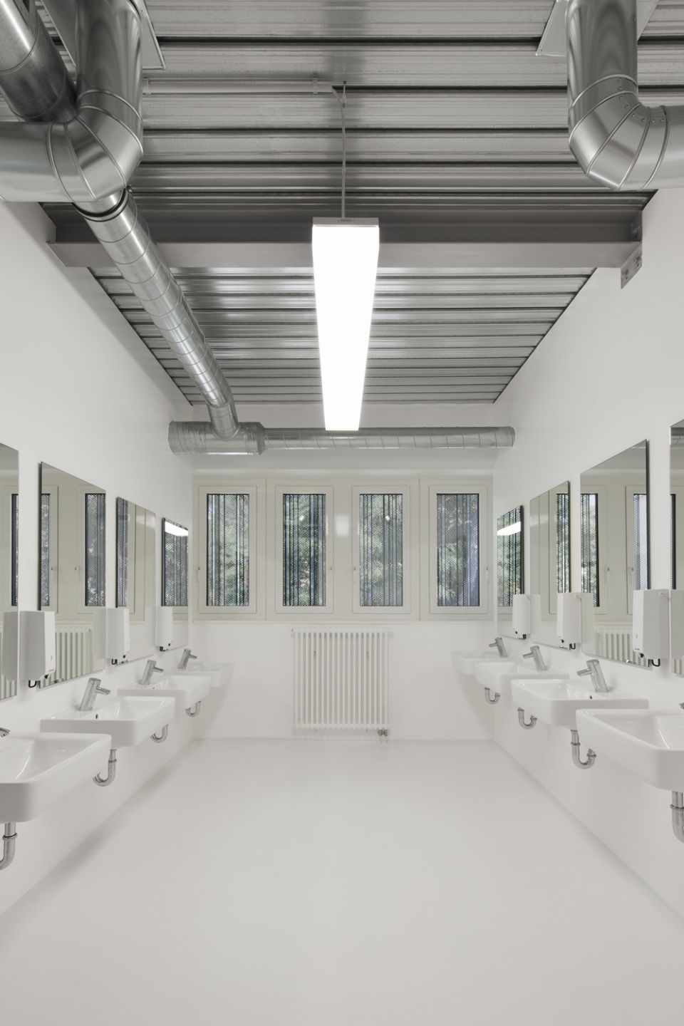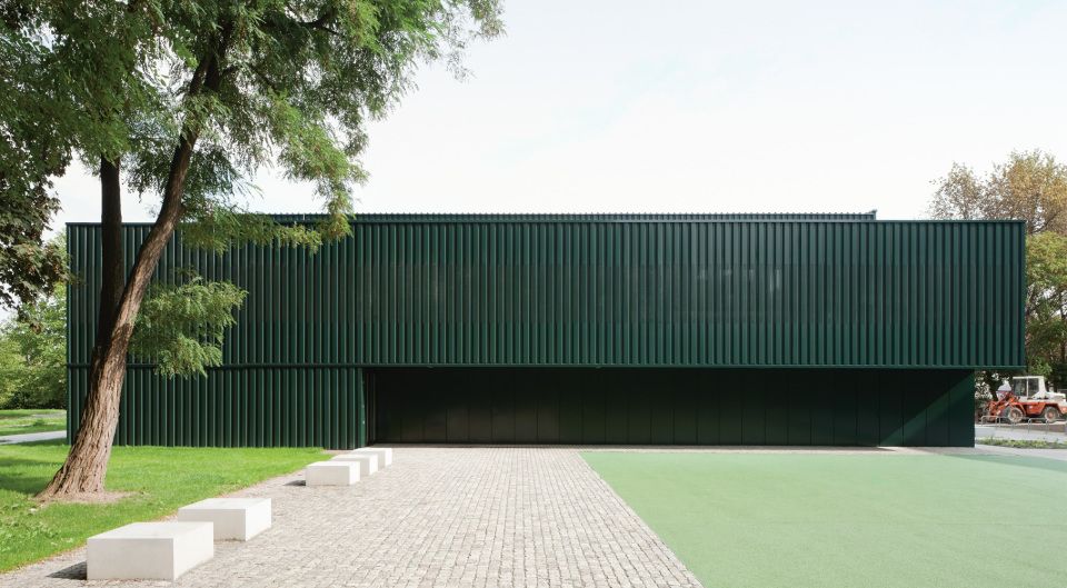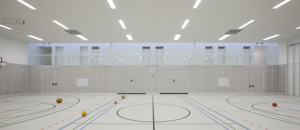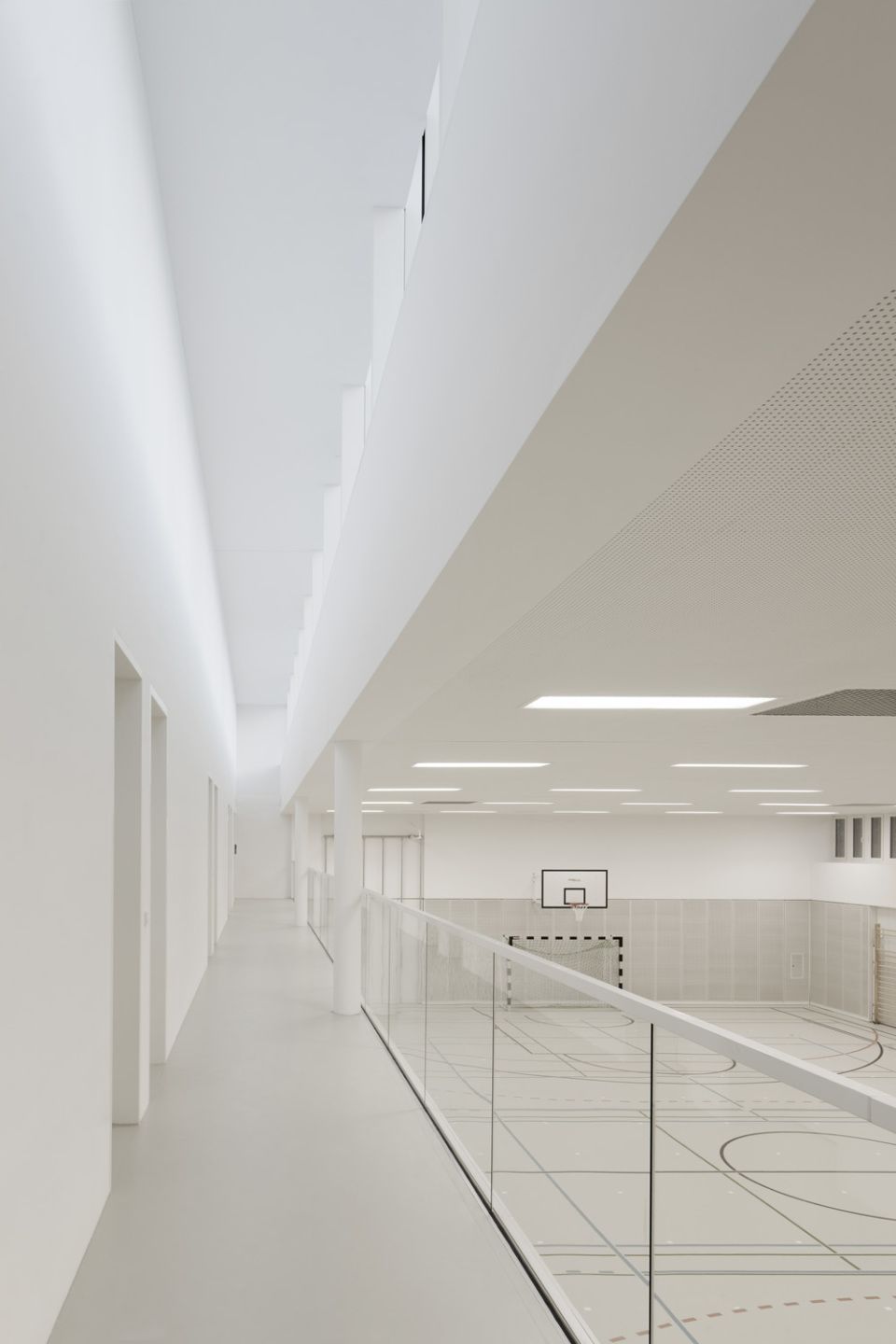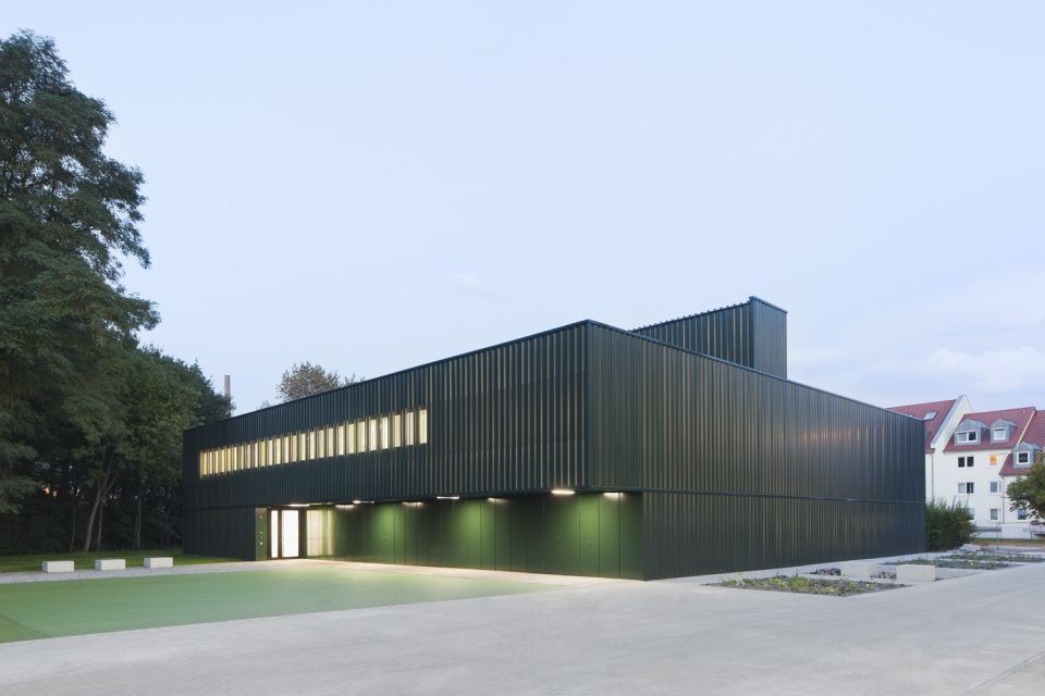 Über die wichtige pädagogische Funktion eines großzügigen, mehrdimensional nutzbaren Aktions- und Bewegungsraums für die Leipziger Franz-Mehring-Schule ist die Sporthalle notwendiger Stadtbaustein, dessen Setzung die Freiflächen der Schule fasst und gegenüber der nahen Kommandant-Prendel-Allee abschirmt. Die Gestaltung der Hülle konzentriert sich auf die Wirkung des Raums und das Farbspiel der dunkelgrünen Metallfassade mit dem alten Baumbestand. Deutlichen Kontrast zur Hülle schafft der weiße, lichtdurchflutete Innenraum der Sporthalle. Vom Foyer erschließt eine einläufige Treppe die Galerie im Obergeschoss, die sich zur Halle hin öffnet. Als zentraler Verteiler ist die Galerie funktionales Zentrum für die Hallenbenutzung und verbindet Umkleiden für Lehrer und Schüler mit dem Hallenbereich. Die offene Glaskonstruktion erlaubt direkte Sichtbeziehungen und einfache Orientierung. Eine zweite Treppe führt auf der gegenüberliegenden Seite der Galerie direkt in die Halle und trennt den Straßen- vom Turnschuhgang. Ein großes Oberlicht über der Galerie generiert gleichmäßigen Tageslichteinfall in die innenliegenden Bereiche der Halle.
