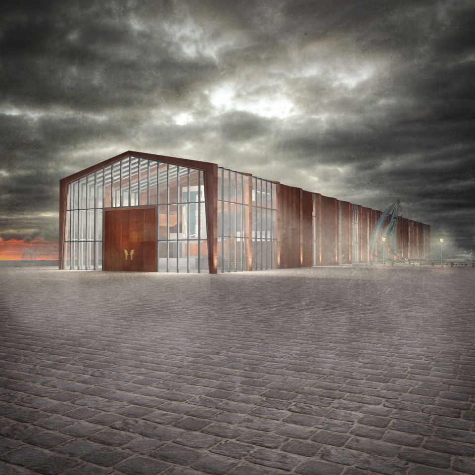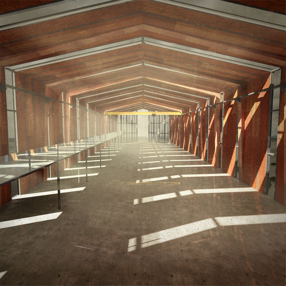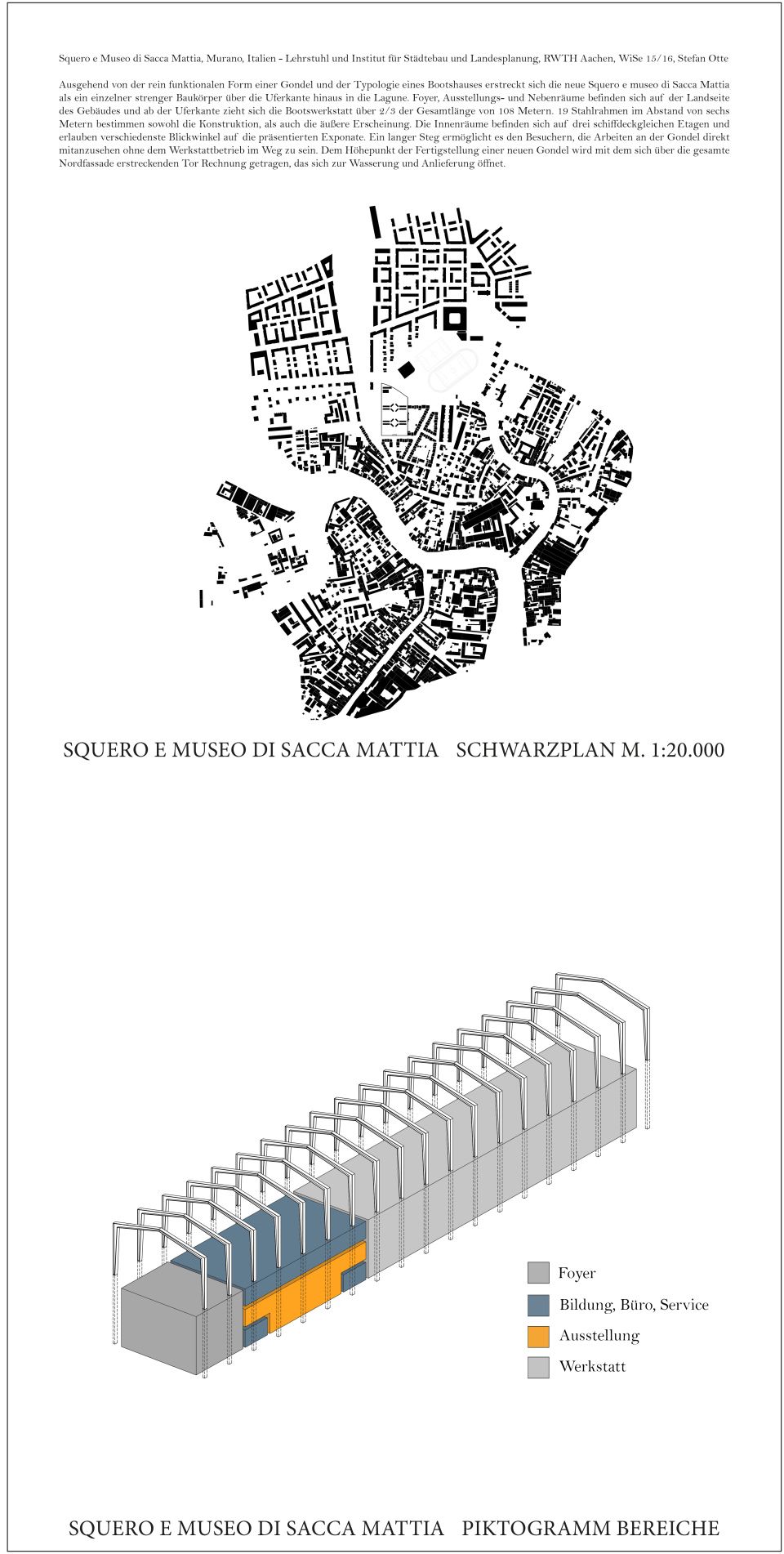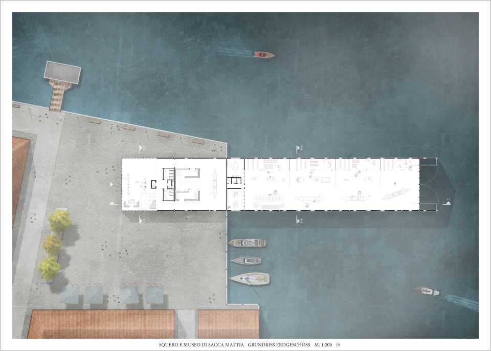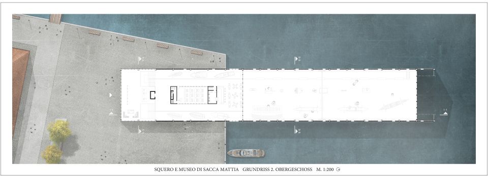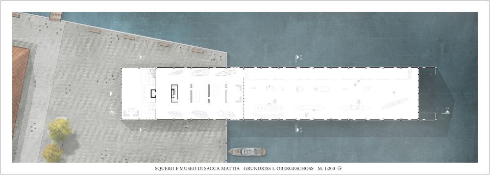 Foyer, Ausstellungs- und Nebenräume befinden sich auf der Landseite des Gebäudes und ab der Uferkante zieht sich die Bootswerkstatt über 2/3 der Gesamtlänge von 108 Metern. 19 Stahlrahmen im Abstand von sechs Metern bestimmen sowohl die Konstruktion, als auch die äußere Erscheinung. Die Innenräume befinden sich auf drei schiffdeckgleichen Etagen und erlauben verschiedenste Blickwinkel auf die präsentierten Exponate. Ein langer Steg ermöglicht es den Besuchern, die Arbeiten an der Gondel direkt mitanzusehen ohne den Werkstattbetrieb zu kreuzen. Dem Höhepunkt der Fertigstellung einer neuen Gondel wird mit dem sich über die gesamte Nordfassade erstreckenden Tor Rechnung getragen, das sich zur Wasserung öffnet.
