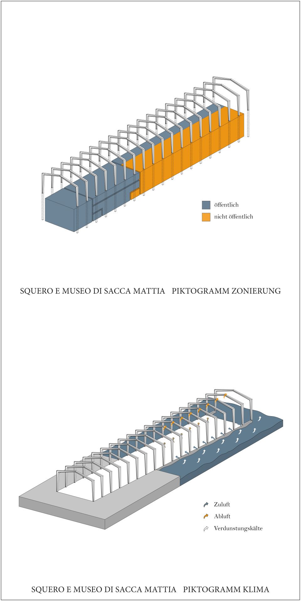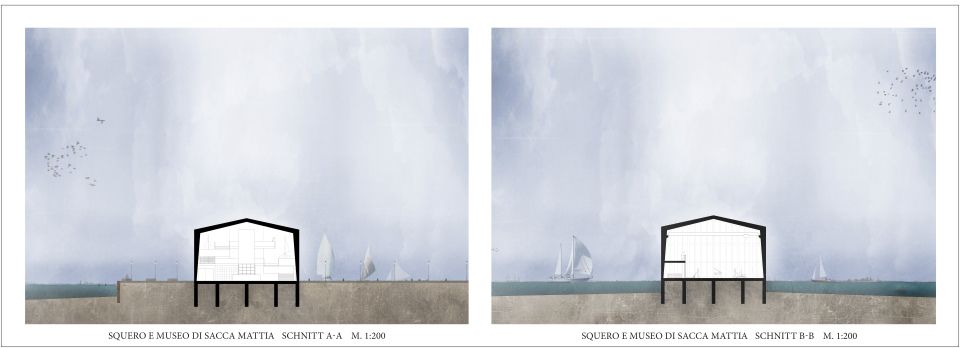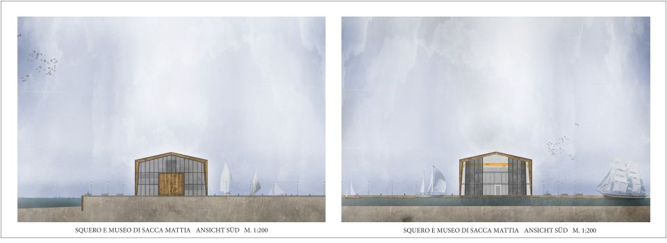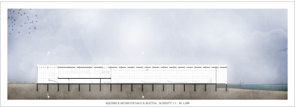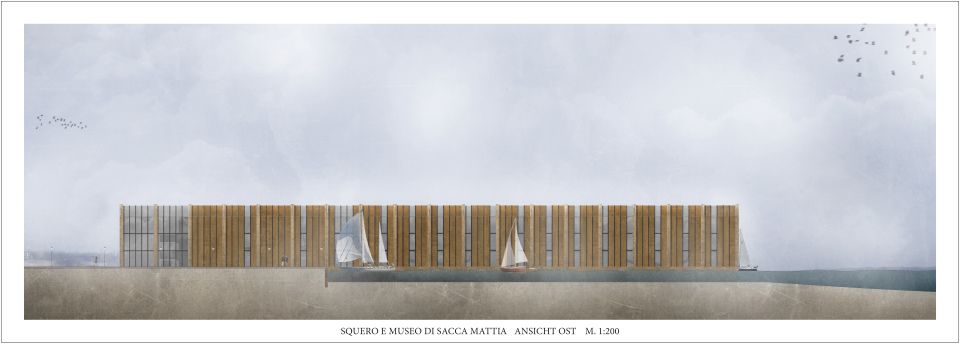 Ausgehend von der rein funktionalen Form einer Gondel und der Typologie eines Bootshauses erstreckt sich die neue Squero e Museo di Sacca Mattia als ein einzelner strenger Baukörper über die Uferkante Muranos hinaus in die Lagune.