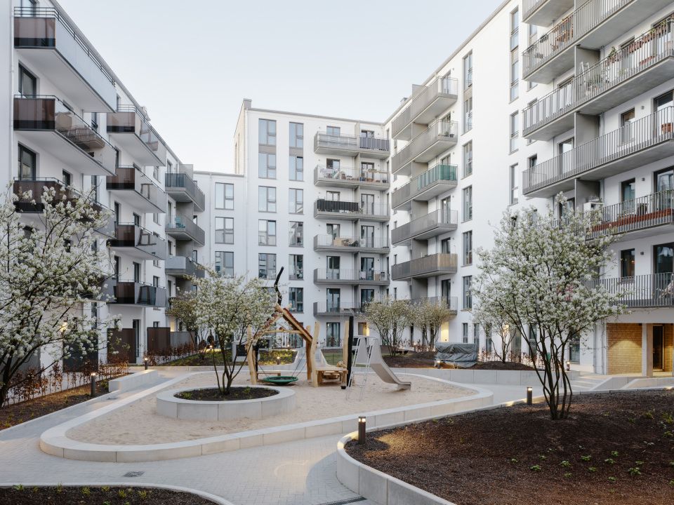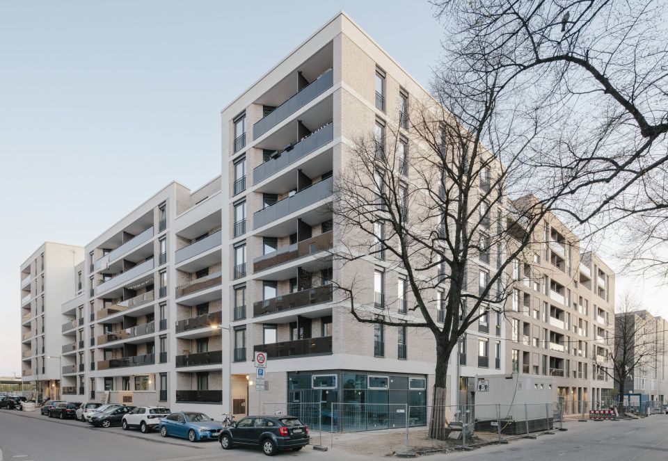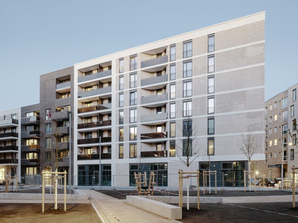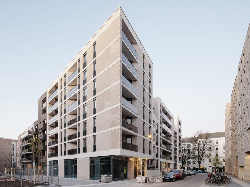 Auf einer gemeinsamen Tiefgarage mit angrenzenden Keller- und Haustechnikräumen entstand eine geschlossene Blockrandbebauung mit 5-7-geschossigen Häusern. Von den 145 Mietwohnungen sind 120 IFB-gefördert und 25 frei finanziert.