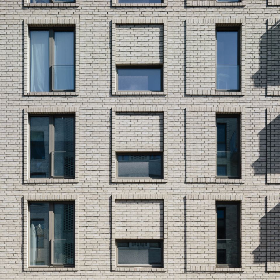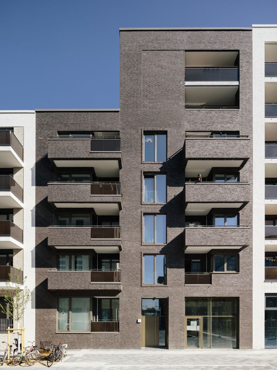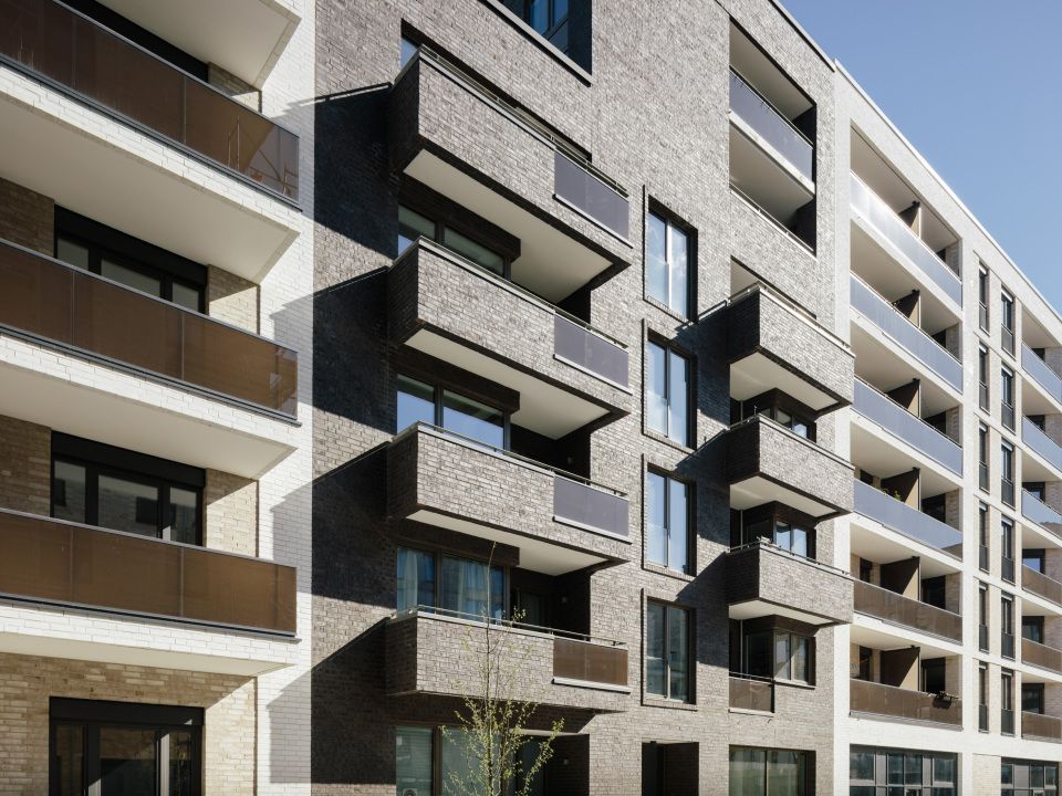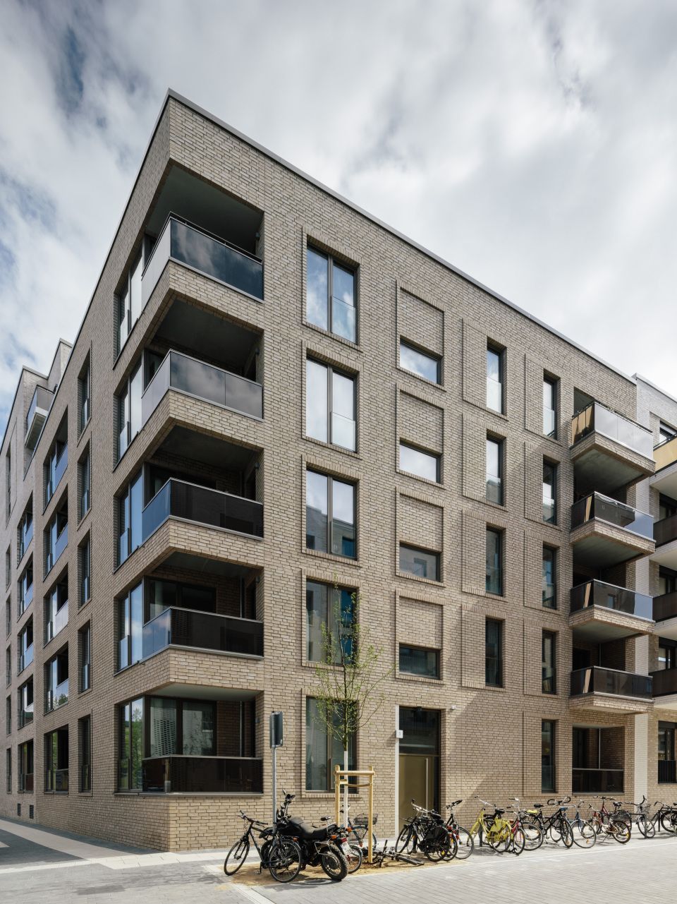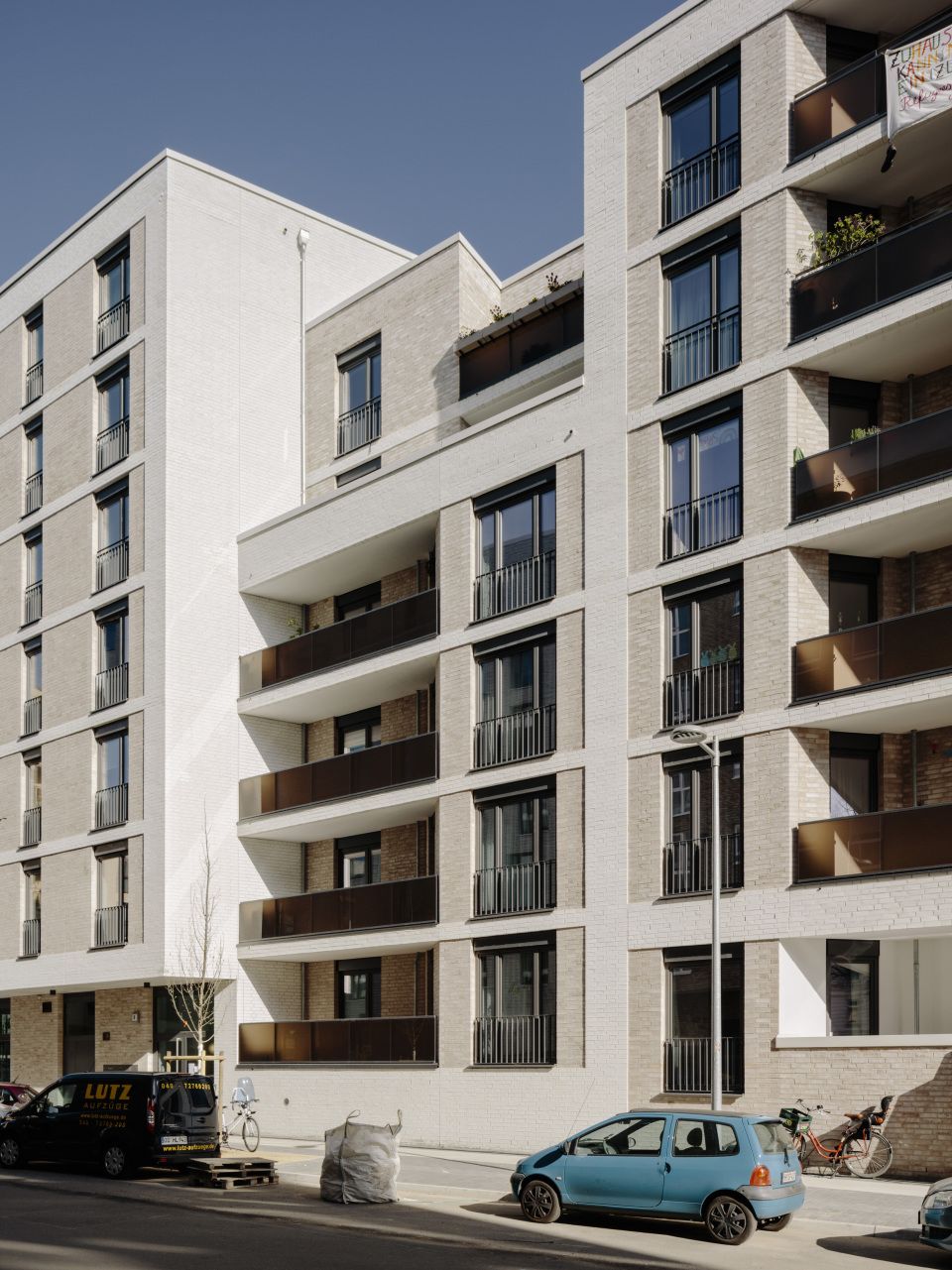 Die Gebäude der BVE zeigen sich in einheitlichem Verblendstein, gegliedert durch eine horizontale und vertikale Rahmung. Aufweitende Loggien bereichern das Fassadenspiel.